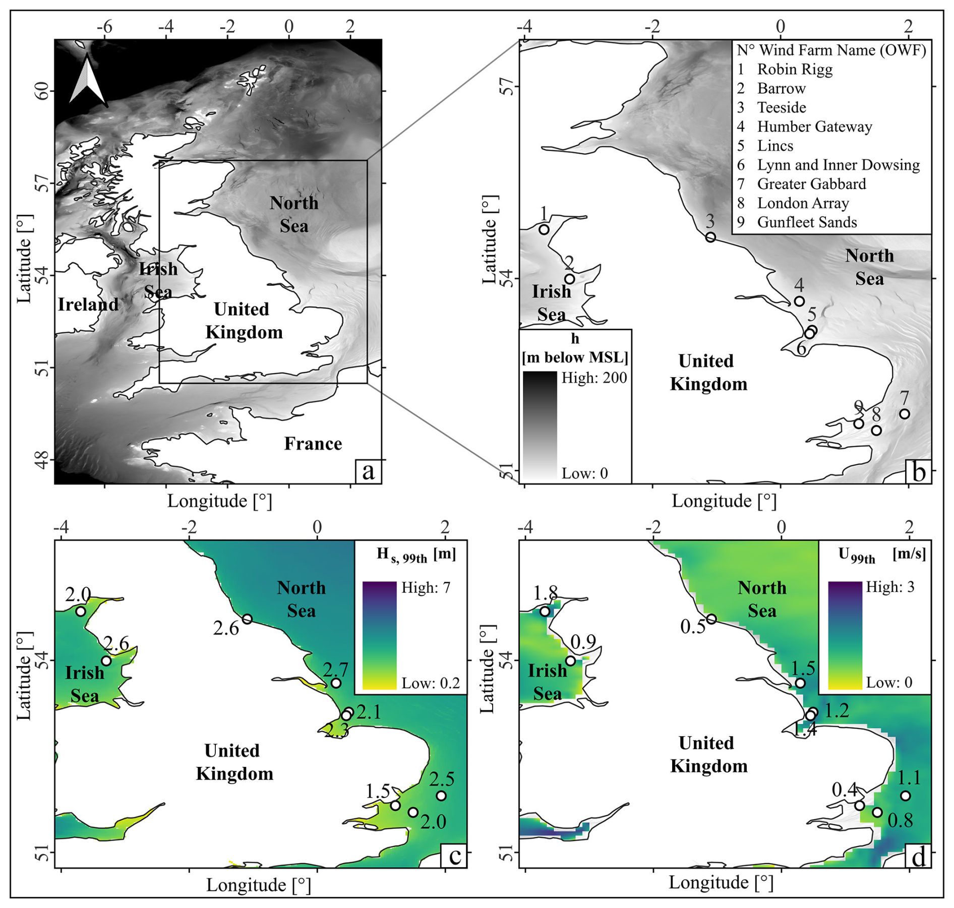 The research area, located in British waters, is illustrated in Fig. 1, showing the specific locations of the nine studied OWFs. Figure 1a provides a general overview, while Fig. 1b pinpoints the positions of the OWFs, labelled 1 to 9. These OWFs correspond to Robin Rigg, Barrow, Teesside, Humber Gateway, Lincs, Lynn and Inner Dowsing, Greater Gabbard, London Array, and Gunfleet Sands, respectively. Figure 1c and d display the 99th percentiles of the significant wave heights (Hs,99) and current velocity magnitudes (U99) at the nine locations, respectively.