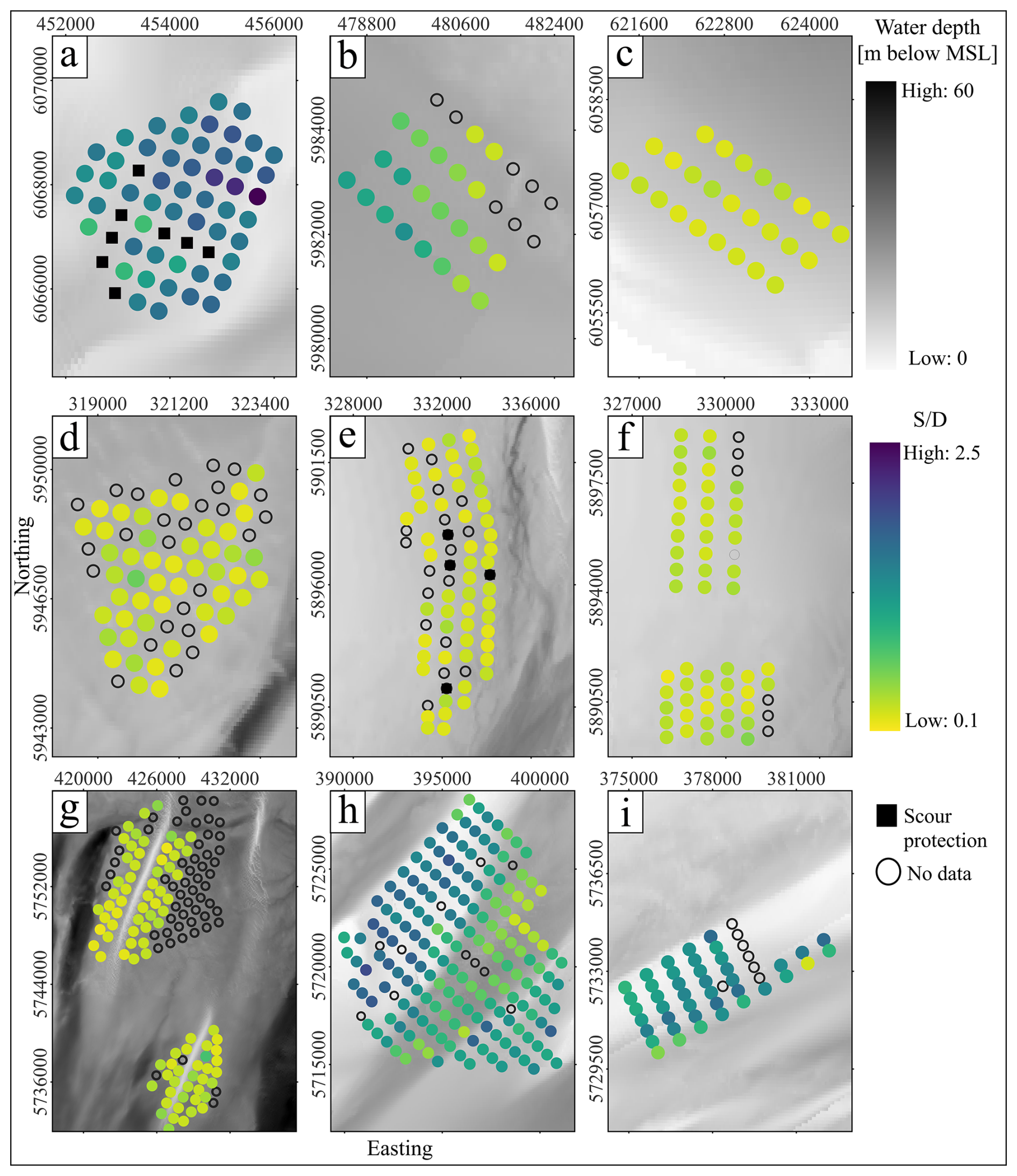 Figure 3Spatial distribution of relative scour depth at the nine studied OWFs. Letters (a)(i) denote the locations of the Robin Rigg, Barrow, Teesside, Humber Gateway, Lincs, Lynn and Inner Dowsing, Greater Gabbard, London Array, and Gunfleet Sands OWFs, respectively. The upper colour map represents water depth, with darker shades indicating deeper water. The lower colour map indicates relative scour depth, with the darker blue colour indicating the largest scour. Filled black squares represent OWESs with scour protection, while empty circles denote missing data. The bathymetry data shown originate from EMODNET (https://emodnet.ec.europa.eu/en/bathymetry, last access: 29 September 2025).