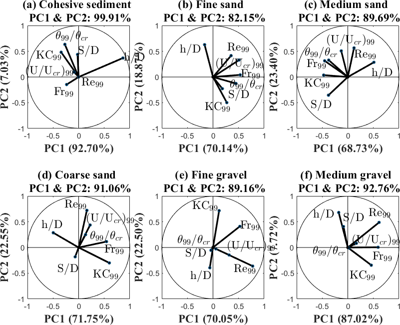 An additional approach to reducing the complexity of multivariate datasets is to initially group the data based on a selected key variable. Accordingly, the PCA was also applied to the dataset after it had been grouped by grain size (d50 diameter) class (Annad et al., 2021), given that the sediment characteristics of the seabed play a significant role in local scour (Qi et al., 2016). This approach facilitated a more precise estimation of local scour, thereby reducing uncertainties related to sediment.