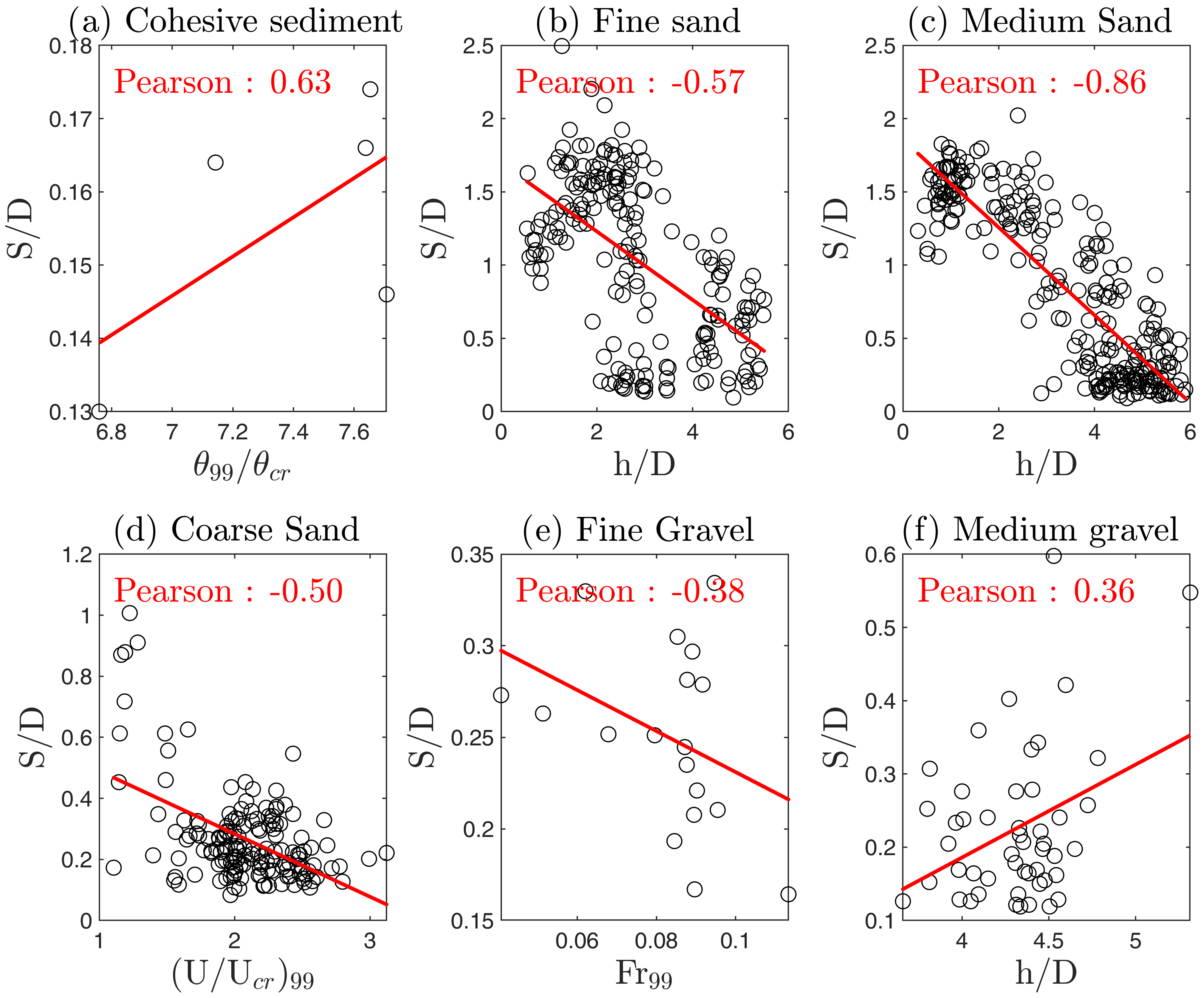 Finally, medium gravel (Fig. 6f) displays a positive correlation between relative scour depth and relative water depth, with a Pearson coefficient of 0.36. This indicates that larger relative water depth corresponds to increased scour depth, although the range of this increment remains small (between S/D=0.1 and S/D=0.4). This variation in scour depth is small compared to the correlations observed in fine and medium sands, where changes in relative water depth yield more pronounced differences in relative scour depth. The smaller impact on medium gravel may be attributed to the generally greater resistance of larger sediments to scour, even with increasing relative water depth.