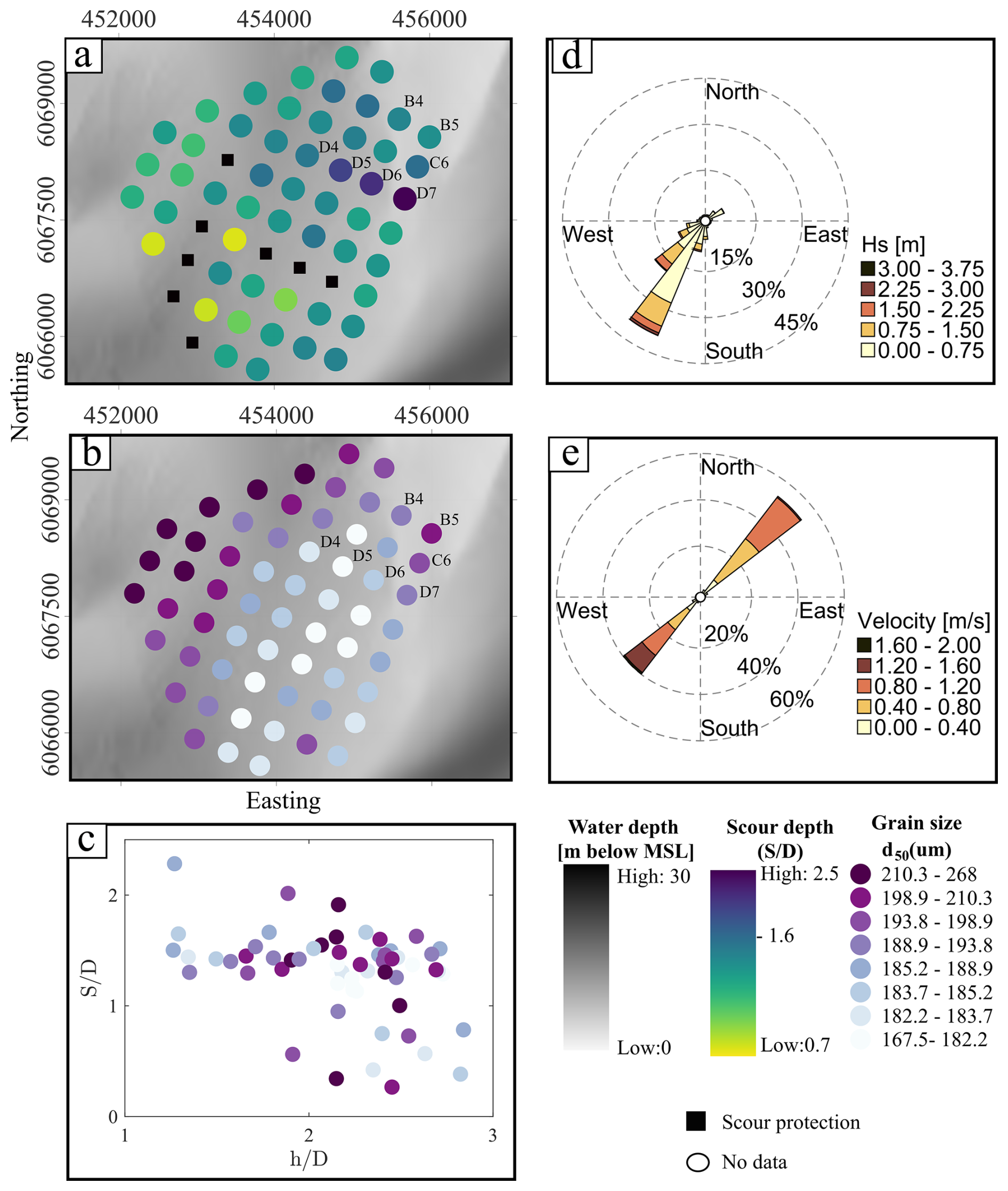 Understanding scour development is a critical first step in assessing potential environmental impacts. It will help determine whether OWESs and entire OWFs contribute to regional sediment mobilization and provide a foundation for future research into the long-term morphological footprint of OWF installations and their broader ecological effects. To contribute to the overarching goal of reducing uncertainty in scour predictions at OWESs, this study analyses field data from 460 monopiles across 9 OWFs, situated in diverse marine regimes with current velocities from 0.54 to 1.77 m s−1 (99th percentile), significant wave heights from 1.5 to 2.7 m (99th percentile), water depths from 5 to 35 m, and grain sizes ranging from cohesive sediment (51.54 µm) to medium gravel (19872 µm). The spatial distribution and variability in relative scour depth across and within these OWFs are determined and correlated with selected hydrodynamic and sedimentological parameters using principal component analysis (PCA). This analysis aims to (1) identify universal drivers of scour across all sites, (2) assess sediment-specific correlations by grain size (d50), and (3) evaluate site-specific variability at the level of three selected OWFs (Robin Rigg, Lynn and Inner Dowsing, and London Array). The site-specific analysis in Sect. 3.5 assesses the robustness of the global correlations under local conditions and provides insight into how local conditions influence scour behaviour. Collectively, these efforts aim to decrease uncertainty in relative scour depth prediction by assessing the contribution of the main drivers of scour development from multivariable field data.