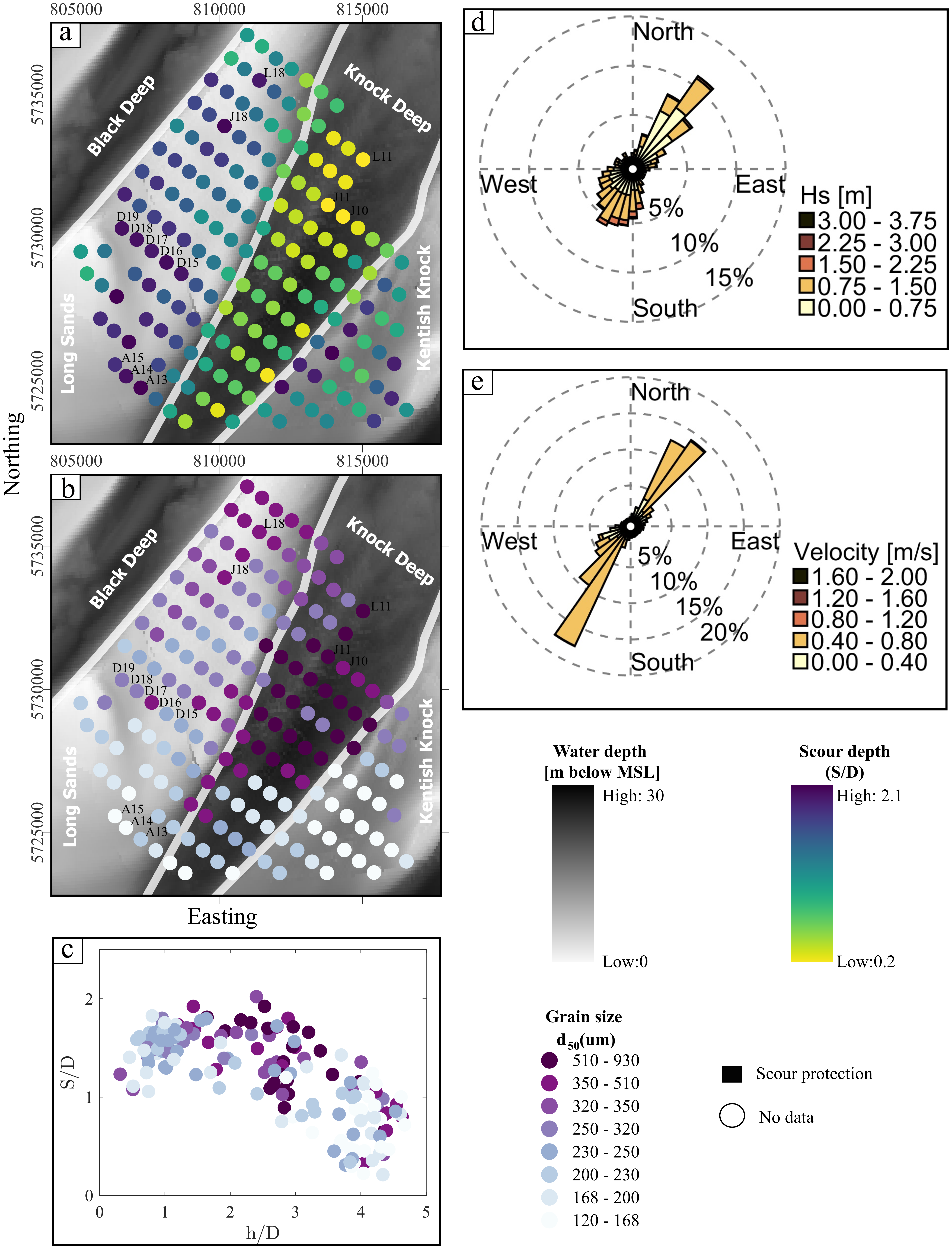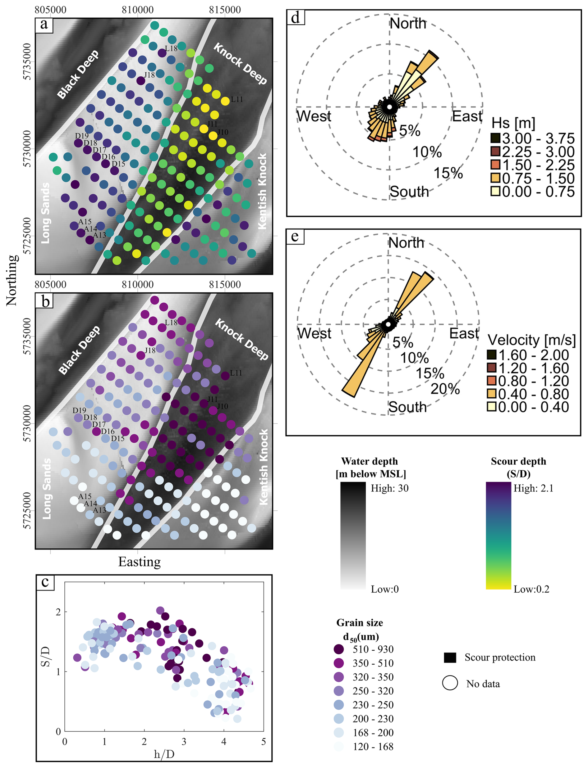 The remaining OWFs showed relatively low relative scour depth and little spatial variability, even though site conditions were significantly different, as indicated by their seabed conditions from very fine sand for Teesside (Fig. 3c) to coarse and very coarse gravel for Humber Gateway (Fig. 3d).