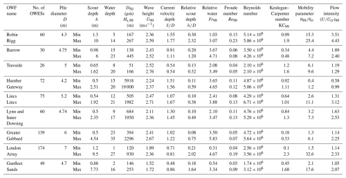 Table 1Overview of studied OWFs with hydrodynamic and sedimentological site conditions.