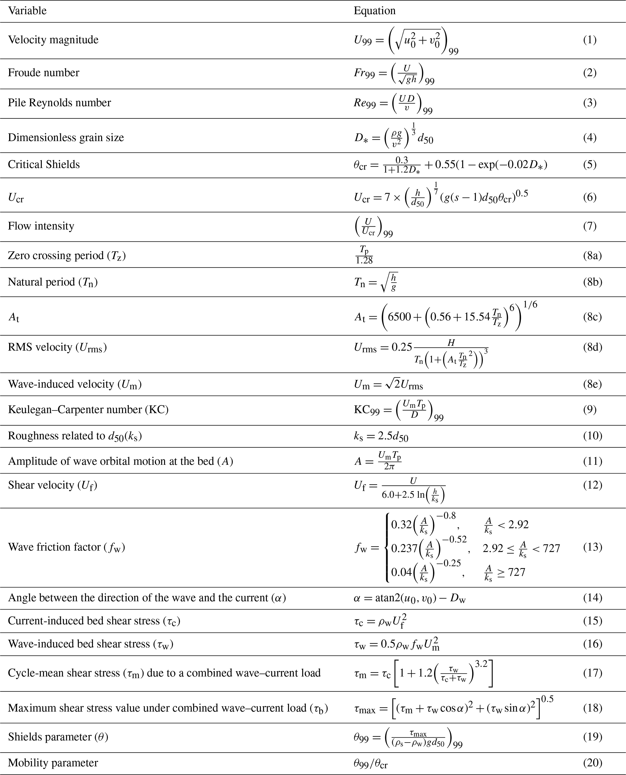 In Eq. (18), the maximum bed shear stress value (τmax) was calculated following Roulund et al. (2016), which builds upon Soulsby (1997) by combining current- and wave-induced shear stress through a directional correction. The Shields parameter (θ99) is derived using Eq. (19), based on the maximum bed shear stress (τmax) under combined wave and current conditions. The Keulegan–Carpenter number is defined in Eq. (10), where Tp is the peak wave period and D the monopile diameter.