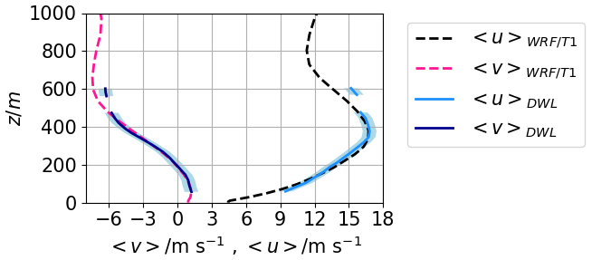 Since November 2020, a long-range, scanning DWL has been installed at the WiValdi site to measure vertical profiles of wind speed and direction over the entire height of the ABL. The DWL is configured to measure in a velocity azimuth display (VAD) mode with a high angular resolution and a specific elevation angle to obtain accurate measurements of the mean wind vector profile as well as TKE and its dissipation rate (Wildmann et al., 2020). A microwave radiometer has also been installed to obtain temperature and humidity profiles. With this combination of instruments, long-term statistics and typical characteristics of atmospheric conditions at the site can be determined (Wildmann et al., 2022). In Sect. 5, the zonal and meridional velocity components of an idealized precursor simulation are assimilated towards more complex target profiles corresponding to one measured situation in a stably stratified atmosphere. A 10 min time average profile covering the period from 18:30 to 18:40 UTC of 19 November 2021 was selected, which features strong wind shear near the ground and a large wind veer in the ABL under weakly stably stratified conditions (confirmed by analyzing observed vertical temperature profiles taken from the microwave radiometer). As continuous measurements are only available from z=57 m up to z=470 m, a simulation with WRF was performed for this period and continuous velocity profiles were generated. The WRF setup and the generation of the target profiles used are described in Appendix A. We refer to the zonal and the meridional target velocities generated by the WRF simulation as target T1. As the measured velocities show a more complex structure, the WRF simulation in this work is a tool in order to generate a continuous target profile for the zonal and meridional velocities which shall reduce the uncertainty of a rough fit through the measurements. Figure 1 shows the measured velocity profiles 〈u〉DWL and 〈v〉DWL (uncertainties of ±0.5 m s−1 are indicated by shaded areas; cf. Wildmann et al., 2022) and the continuous profiles from the WRF simulation and .