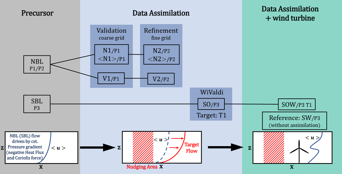 While the methods of Allaerts et al. (2020) and Stipa et al. (2024) have been directly developed for wind turbine applications, the method of Nakayama and Takemi (2020) has been applied only at a rather coarse resolution of 40 m horizontally and relaxes only the horizontal wind field. However, the application of this method to higher-resolved LESs including wind turbines would have the advantage that it can reproduce an assimilation of simultaneous measurements, is not limited to horizontal homogeneity, and could possibly be applied in complex terrain. Therefore, it also seems well-suited for wind energy applications. Considering the DLR wind farm WiValdi, it seems to be a worthwhile endeavor to modify the method of Nakayama and Takemi (2020) so that it can be applied in this first approach to a single wind turbine to assimilate more realistic observed wind profiles, with the aim of calculating more complex inflow cases that do not lose their turbulent atmospheric characteristics.