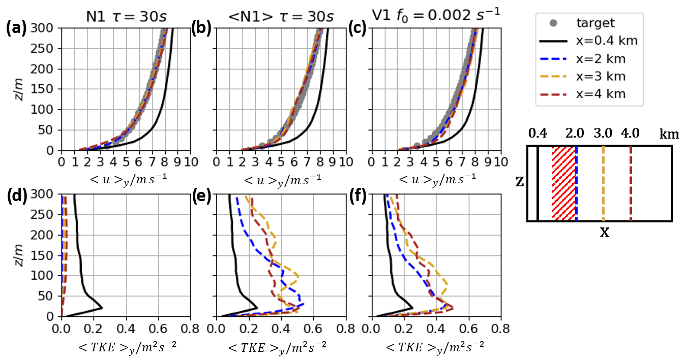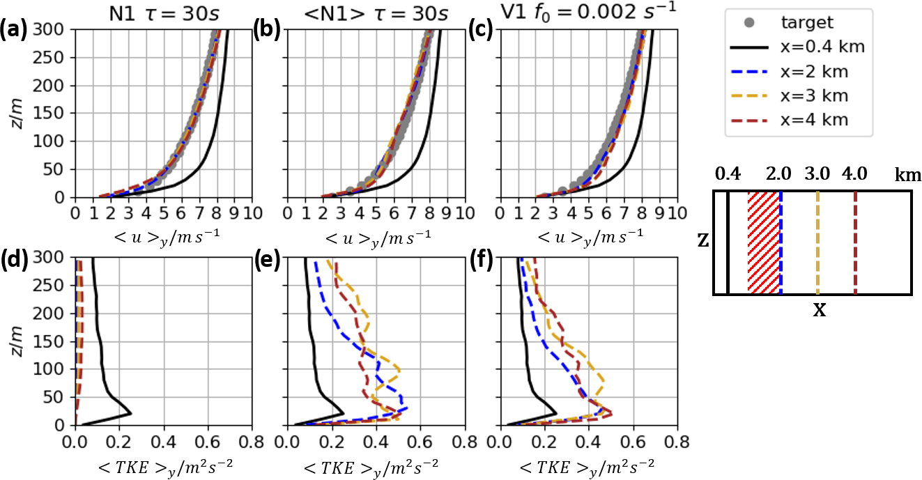 Figure 3Results for the simulations N1, Eq. (4) and 〈N1〉, Eq. (6) with τ = 30 s and V1, and Eq. (7) with f0 = 0.002 s−1. Vertical profiles of the zonal velocities 〈u〉y in (a), (b), and (c) and the 〈TKE〉y in (d), (e), and (f) for different downstream positions. The black solid lines show the quantities for the upstream flow at x=0.4 km. The gray dotted lines represent the target wind profile. The blue (gold, brown) lines refer the downstream positions x=2 km (x=3 km, x=4 km). The scheme on the right side indicates the downstream positions for the evaluation (the red hatched area refers to the nudging zone).