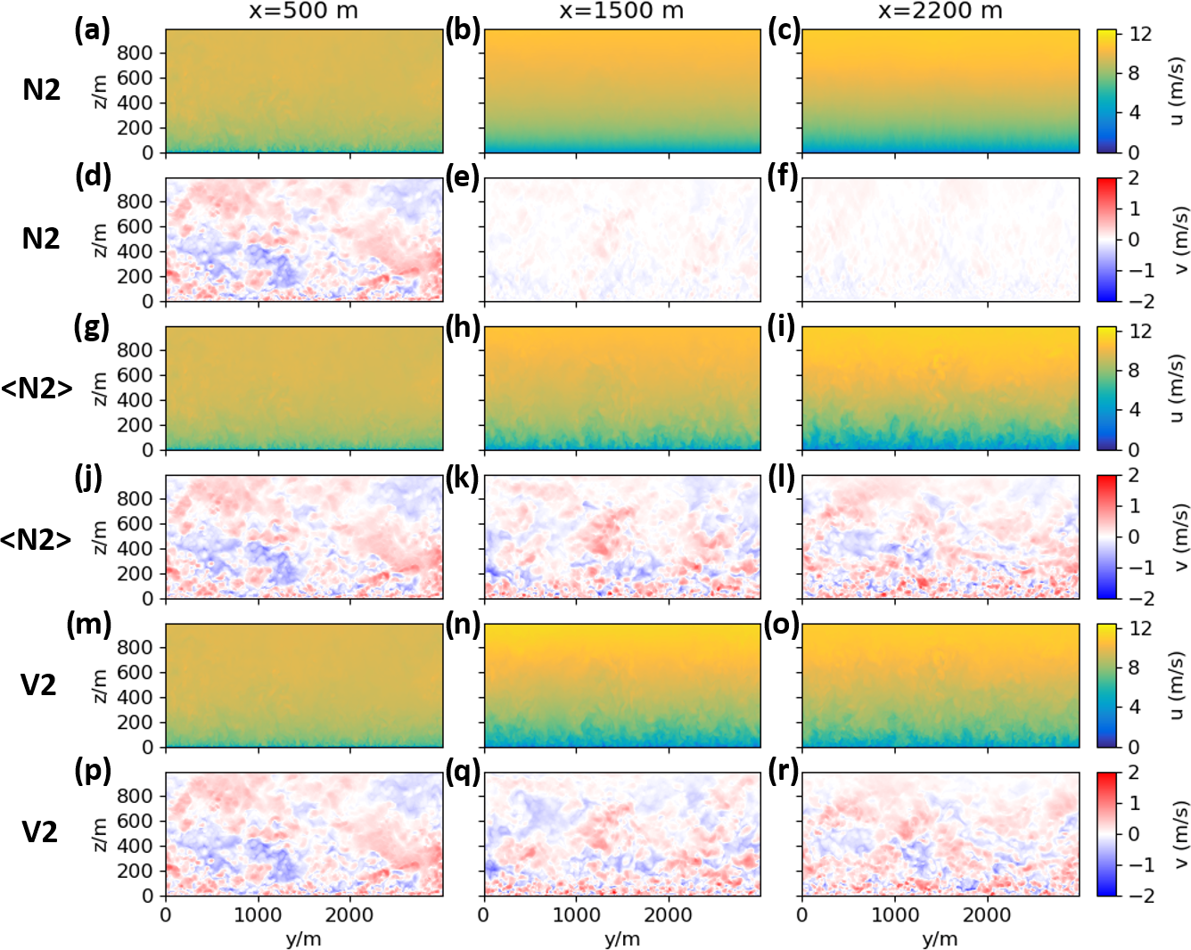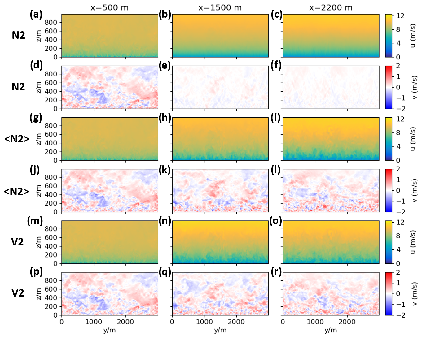 The same difference can be observed for the v components (Fig. 5e and k). The turbulent structures of v are not significantly altered within the relaxation region in simulation 〈N2〉 (Fig. 5k), while they are strongly suppressed in simulation N2 (Fig. 5e). This behavior in the relaxation region at x=1500 m is similar for the downstream position x=2200 m. From Fig. 5 it can be concluded that the turbulent structure of the eddies in the simulation domain are severely affected by the local Newtonian method, while the Newtonian relaxation and the vibration method seem to be less intrusive.