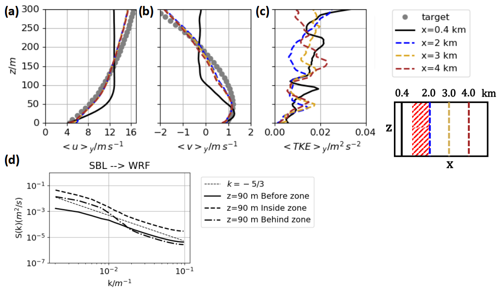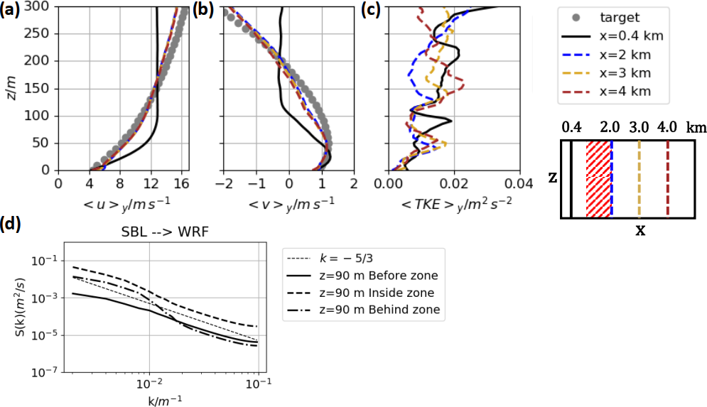 Figure 6Results for SO of the assimilation towards the representative WRF velocity profile with the precursor simulation P3 and application of the vibration method (f0=0.002 s−1). (a) Zonal velocity 〈u〉y, (b) meridional velocity 〈v〉y, and (c) 〈TKE〉y. The black solid lines refer to the values upstream of the nudging zone. The gray dotted lines in (a) and (b) indicate the zonal and meridional target velocity profile T2. The colored lines show the values for the downstream positions according to the scheme on the right. In (d) the horizontal energy spectra are shown for the height z=90 m (length 500 m, width 3000 m) for the flow before, inside, and behind the nudging zone.