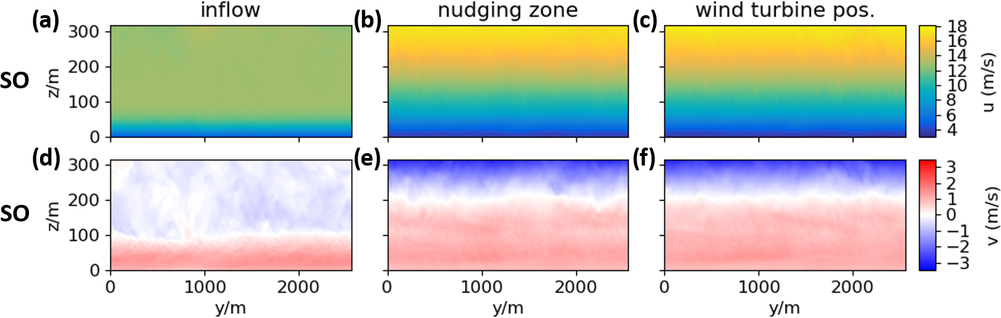 Figure 7Vertical cross-sections of the zonal and the meridional velocity u and v for the inflow area before the nudging zone (a, d), the outflow of the nudging zone (b, e), and downstream of the nudging zone at the wind turbine position (c, f). The results are shown for the simulation SO.