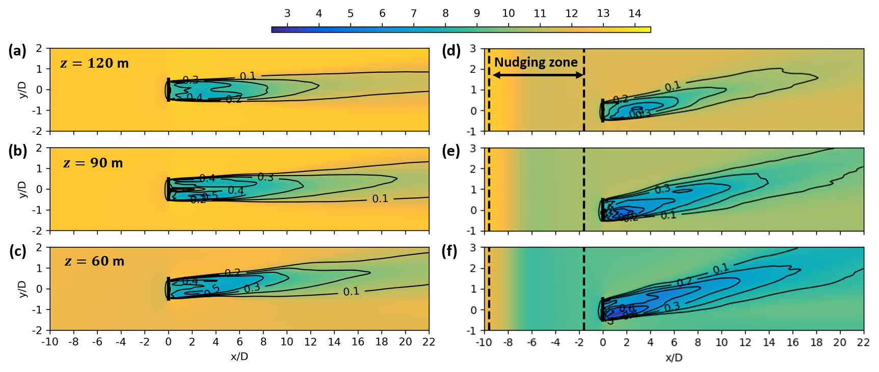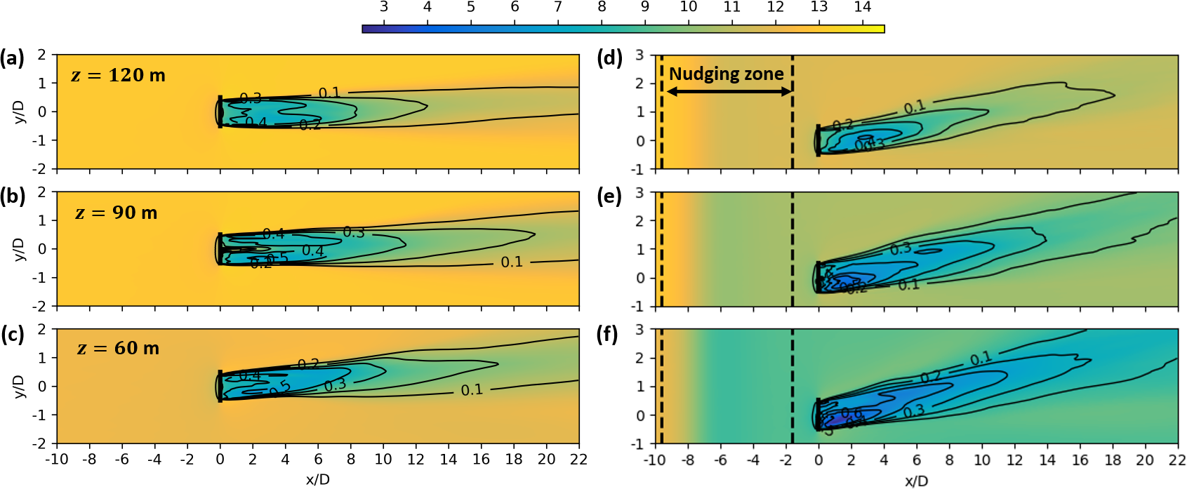 Figure 8Colored contours of the time-averaged zonal velocity component in m s−1 for SW in (a), (b), and (c) and for SOW in (d), (e), and (f) averaged over 20 min at the end of the simulation. Panels (b) and (e) show the x–y plane at hub height z=90 m. Panels (a) and (d) (c and f) correspond to the x–y planes at m ( m). The black contours represent the velocity deficit at the same vertical location calculated in relation to the upstream velocity at m. The axes are normalized by the rotor diameter D=126 m, whereby indicates the position of the rotor.