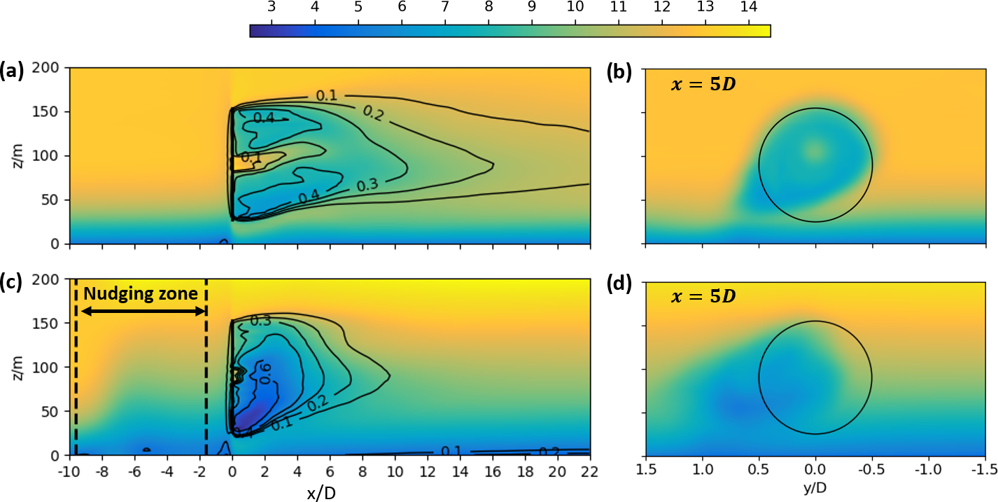 Figure 9Colored contours of the time-averaged zonal velocity component in m s−1 without assimilation in (a) and (b) and with vibration assimilation in (c) and (d) averaged over 20 min at the end of the simulation. In (a) and (c) the vertical x–z plane at the position y=0 perpendicular to the turbine is presented. The black contours represent the velocity deficit at the same spanwise location calculated in relation to the upstream velocity at m. The abscissa is divided by the diameter of the rotor, whereby indicates the position of the rotor. Panels (b) and (d) show the zonal velocity component at a downward position of x=5 D. The black circles represent the rotor area.