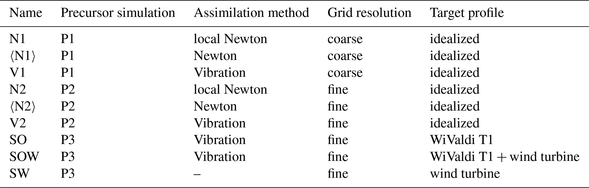 Table 1 gives an overview of all simulations performed in this study. Figure 2 shows a schematic illustration of the simulation approach used in this study. The numerical simulations are separated into precursor simulations (P1, P2, and P3 in Fig. 2) and simulations with data assimilation (N1, 〈N1〉, V1, N2, 〈N2〉, V2, and SO in Fig. 2) (+ wind turbine simulations, SW and SOW in Fig. 2). A precursor simulation is necessary so that characteristic atmospheric turbulence can spin up in the computational domain. The precursor simulations P1, P2, and P3 employ periodic lateral boundary conditions and are run until a fully developed turbulent state prevails. In the subsequent simulations, in which the output of the precursor simulations is used as the inflow field, either the local Newtonian relaxation according to Eq. (4) (N1, N2), the Newtonian relaxation according to Eq. (6) (〈N1〉, 〈N2〉), or the vibration method using Eq. (7) (V1, V2, SO) is applied.