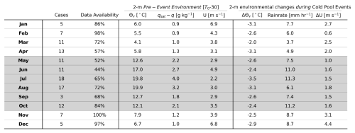 Table 2Monthly climatology of detected cold-pool cases; 1 min ground station data availability; 2 m median pre-event environmental conditions (30 min before detected cold-pool passage; e.g., T0−30) in terms of θv (°C), saturation deficit (qsat−q, g kg−1), and total wind speed (m s−1); and 2 m median environmental changes during cold-pool events (relative to T0−30) in terms of minimum θv (°C), maximum rainfall rate (mm h−1), and maximum total wind speed (m s−1). The pre-event environment provides a proxy for the background environment. Gray shading indicates the warm season at WiValdi, as shown by θv.