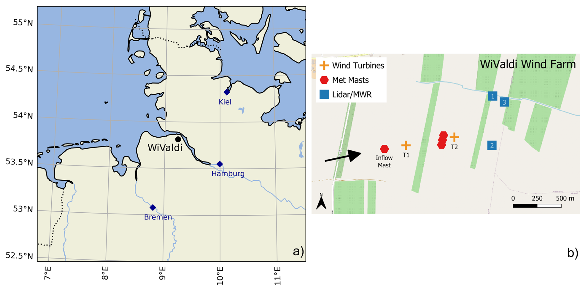 Figure 1(a) Map of northern Germany centered on the location of the WiValdi wind farm. Blue diamonds indicate nearby major cities, while dashed lines indicate country borders. (b) Detailed layout of WiValdi, indicating the locations of the wind turbines, meteorological masts, MWR, lidar, and underlying simple terrain. The blue squares represent the location of both the lidar and the MWR, with the overlaid numbers indicating their different positions in chronological order: November 2020–March 2022 (1), October 2022–May 2024 (2), and May 2024–present (3). The black arrow indicates the primary west-southwesterly wind direction at WiValdi. Background map: © OpenStreetMap contributors 2025. Distributed under the Open Data Commons Open Database License (ODbL) v1.0.