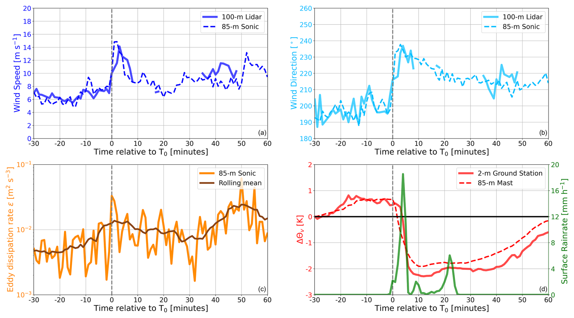 After the cold-pool gust front passage, which is strongly indicated by the rapid wind speed increase and θv drop onset at T0−5 min, the near-surface wind speed gradually weakens to below the pre-event value, and the near-surface wind direction gradually shifts back towards ∼ 230° as the cold-pool interior and parent convective cell pass by. The near-surface θv similarly recovers towards its pre-event state, though notably remains 1 K colder by T0+60 min than at T0−30. This may suggest that cold pools still propagate past WiValdi even 1 h after the leading gust front or, at minimum, that there is a lasting effect from the observed cold pools on the near-surface environment of at least 1 h. Kruse et al. (2022) noted that temperature recovery typically occurred only after 2 h for their cases in the Netherlands. So, while the kinematic changes accompanying the gust front are rapid (5–10 min) and would thus likely have an impact on turbine structural loads, the thermodynamic environment changes more gradually, with longer-lasting implications for turbine wakes and power generation.