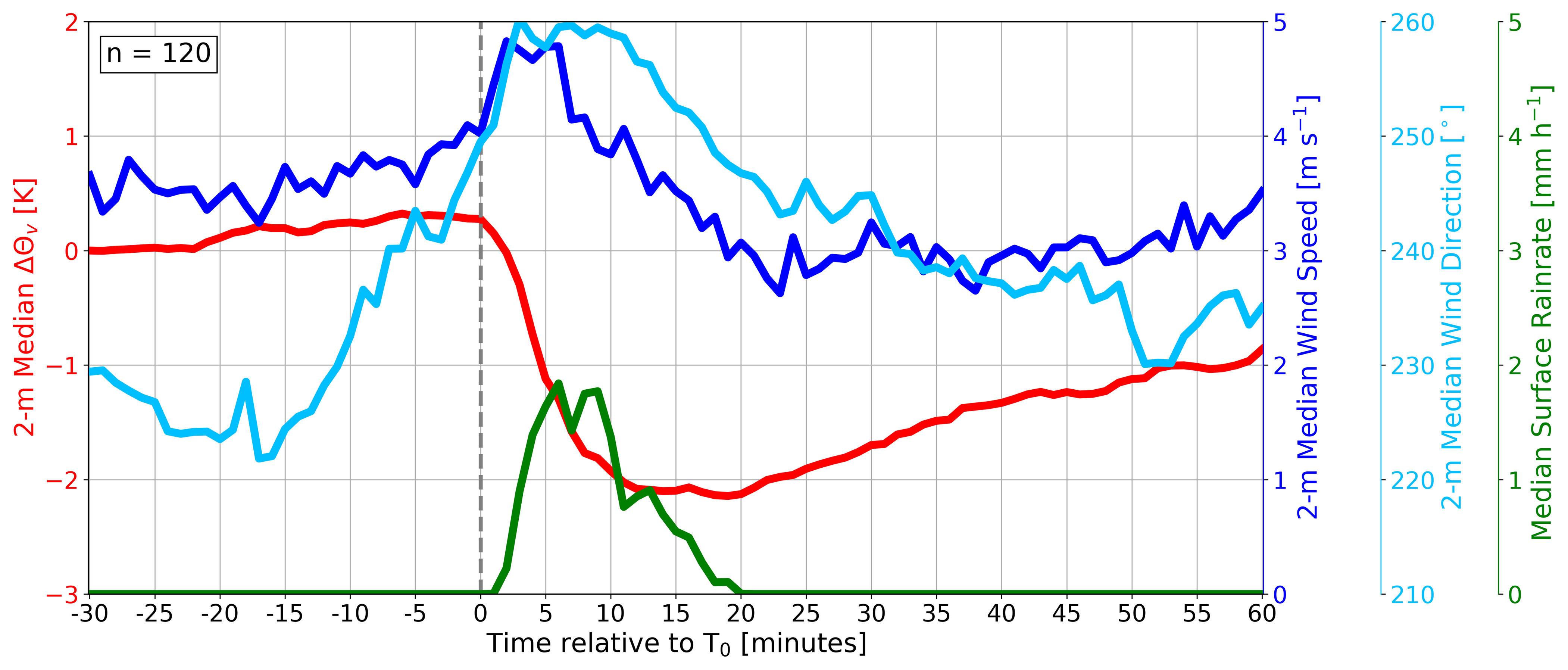 Figure 4Median near-surface characteristics of the detected cold-pool cases, as measured by the 2 m ground station attached to the MWR relative to T0 (dashed gray line), in terms of Δθv from T0−30 min (K; red), wind speed (m s−1; dark blue), wind direction (°; light blue), and rainfall (mm h−1; green). Detected cold-pool sample size is given in the upper-left corner.