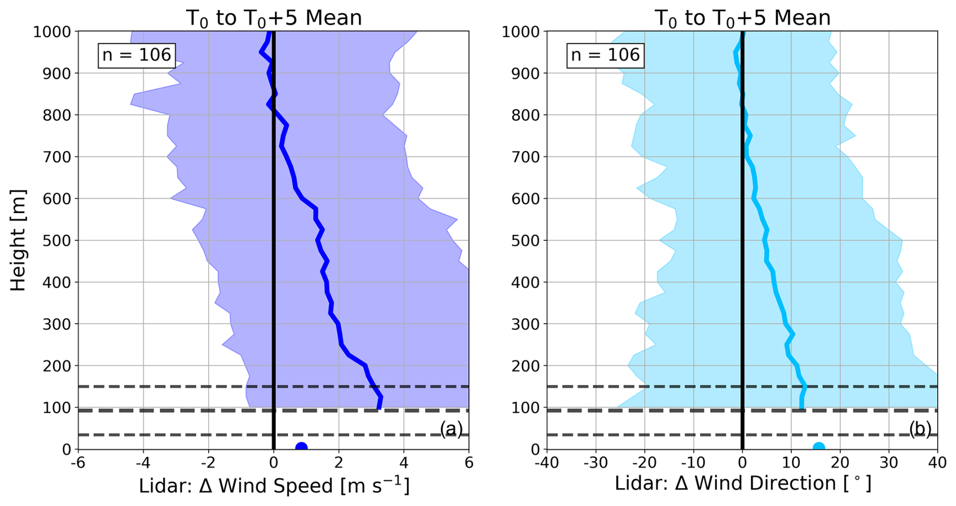 Figure 6Mean vertical profiles over the given time periods relative to the pre-event environment (T0−30 min) for (a) wind speed (m s−1; dark blue) and (b) wind direction (∘; light blue). Dots correspond to the median 2 m ground station observations averaged over the given time periods. Solid colored lines indicate the median conditions, while shading indicates the 10th–90th percentile spread. Horizontal dashed black lines indicate the turbine bottom (34 m), hub (92 m), and top (150 m). Detected cold-pool sample size is given in the upper-left corner.