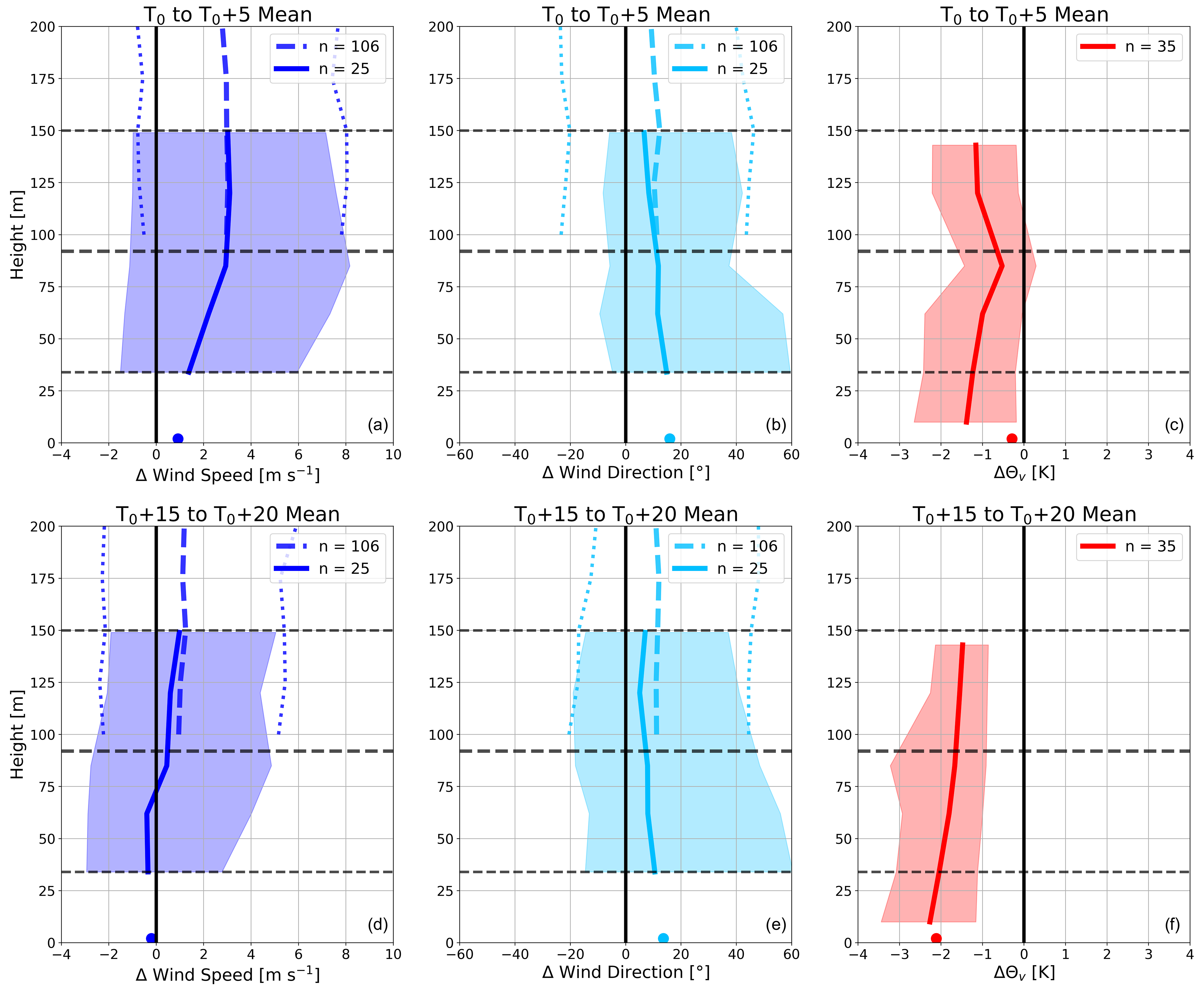 Figure 7Mean vertical profiles within the turbine rotor layer over the given time periods for (a, d) wind speed (m s−1; dark blue), (b, e) wind direction (°; light blue), and (c, f) θv (K; red) changes relative to T0−30 min using inflow mast (solid) and lidar (a–b, d–e; dashed) measurements. Horizontal dashed black lines indicate the turbine bottom (34 m), hub (92 m), and top (150 m). In situ ground station measurements are shown as dots at 2 m. Median values are shown in bold and thicker dashed colored lines, with the 10th and 90th percentiles shown in shading and smaller dotted colored lines. Detected cold-pool sample sizes per instrument are given in the upper-right corner.
