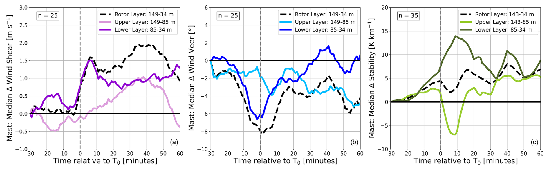 Figure 8Median changes in inflow mast (a) wind shear (m s−1), (b) wind veer (°), and (c) static stability (K km−1) relative to the pre-event environment (T0−30 min) over the lower layer (85–34 m; darker lines), upper layer (149–85 m, a–b, 143–85 m, c; lighter lines), and full rotor layer (149–34 m; dashed). Sample sizes are given in the upper-left corner.