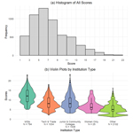 Figure 5The distribution of scores illustrated by (a) a histogram and (b) violin plots showcasing the interquartile ranges and distribution shapes by institution type. Note that total counts exceed 5106 due to institutions falling in multiple categories.