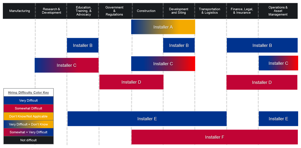 Figure 1Data gathered for the 2022 Distributed Wind Market Report revealed that most DW installers have difficulty hiring across all industry segments. For example, Installer D worked across government and regulations, construction, finance, and operations segments and reported finding hiring somewhat difficult.