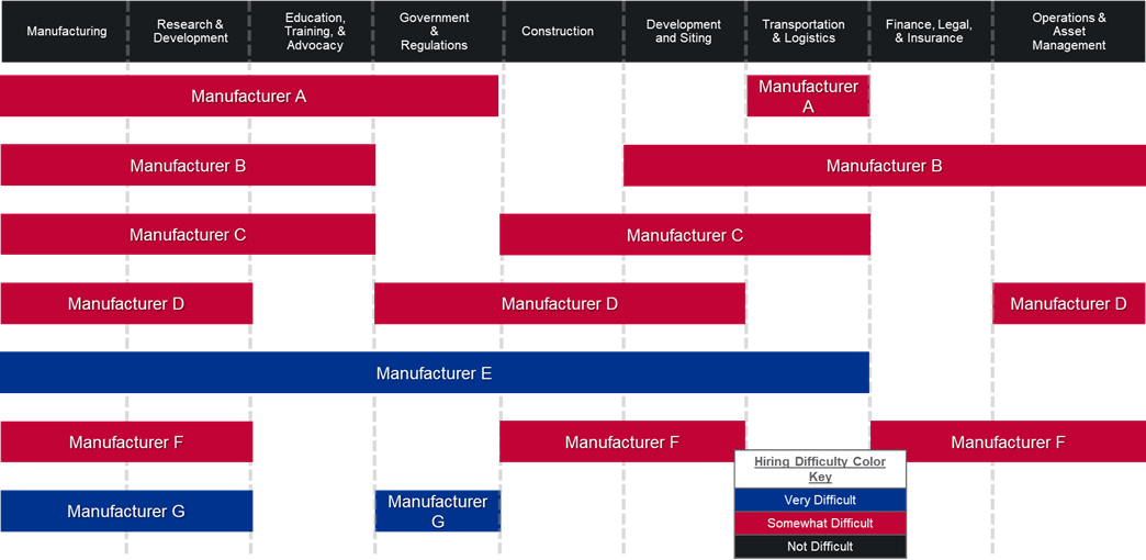 Figure 2Data gathered for the 2022 Distributed Wind Market Report revealed that most DW manufacturers had difficulty hiring across all industry segments, as evidenced by each company's blue or red shading.