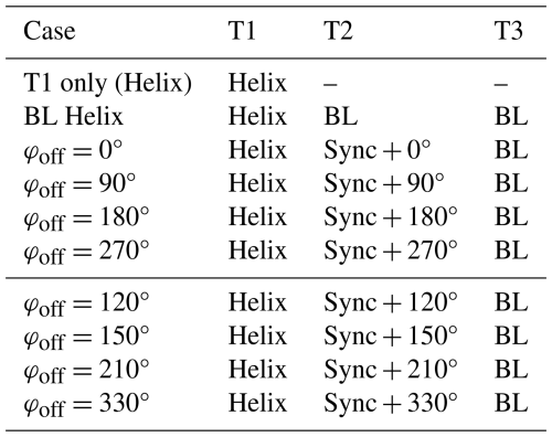 where is the azimuthal position of blade at t=0. Note that , and choosing St≤0.4 for a typical tip speed ratio (TSR) TSR ≈ 6 ensures and thus stays far from any low-frequency aliasing. Typically, the CCW Helix variant yields greater energy gains for the downstream turbine (Frederik et al., 2020a; Taschner et al., 2023), while the CW Helix is preferred for its reduced impact on pitch bearing wear (van Vondelen et al., 2023a), attributed to the lower effective actuation frequency of ωr−ωe.