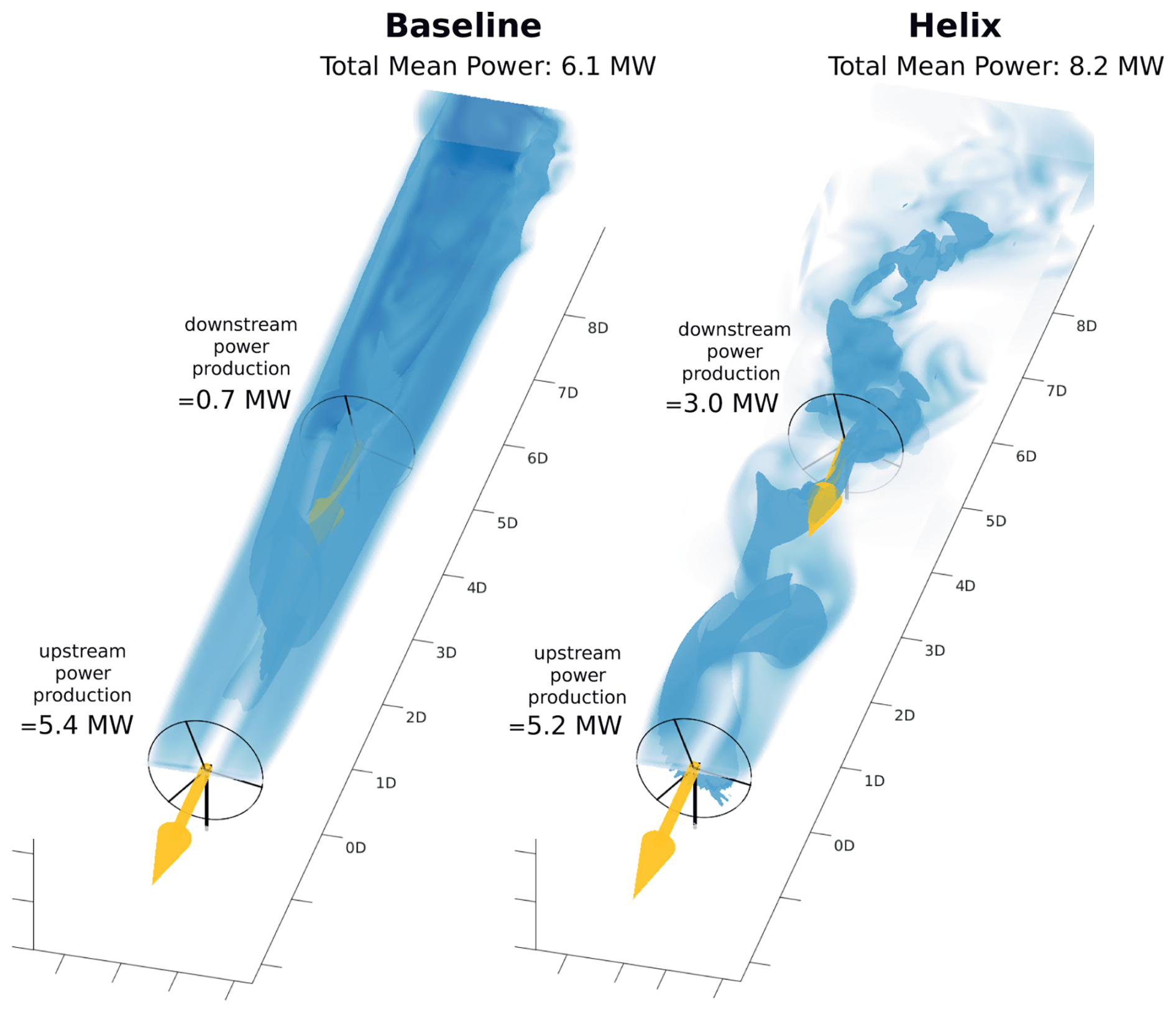 Figure 1Visualization of the Helix approach (right) and the baseline case (left) in a two-turbine setup during full wake overlap, based on data from a large-eddy simulation study in purely laminar inflow by (Frederik et al., 2020a). The image, adapted from (Meyers et al., 2022), shows the velocity magnitude in light blue and the isosurface of velocity in dark blue. The x axis indicates the turbine spacing normalized by the rotor diameter D. For further simulation details, please refer to the referenced works.