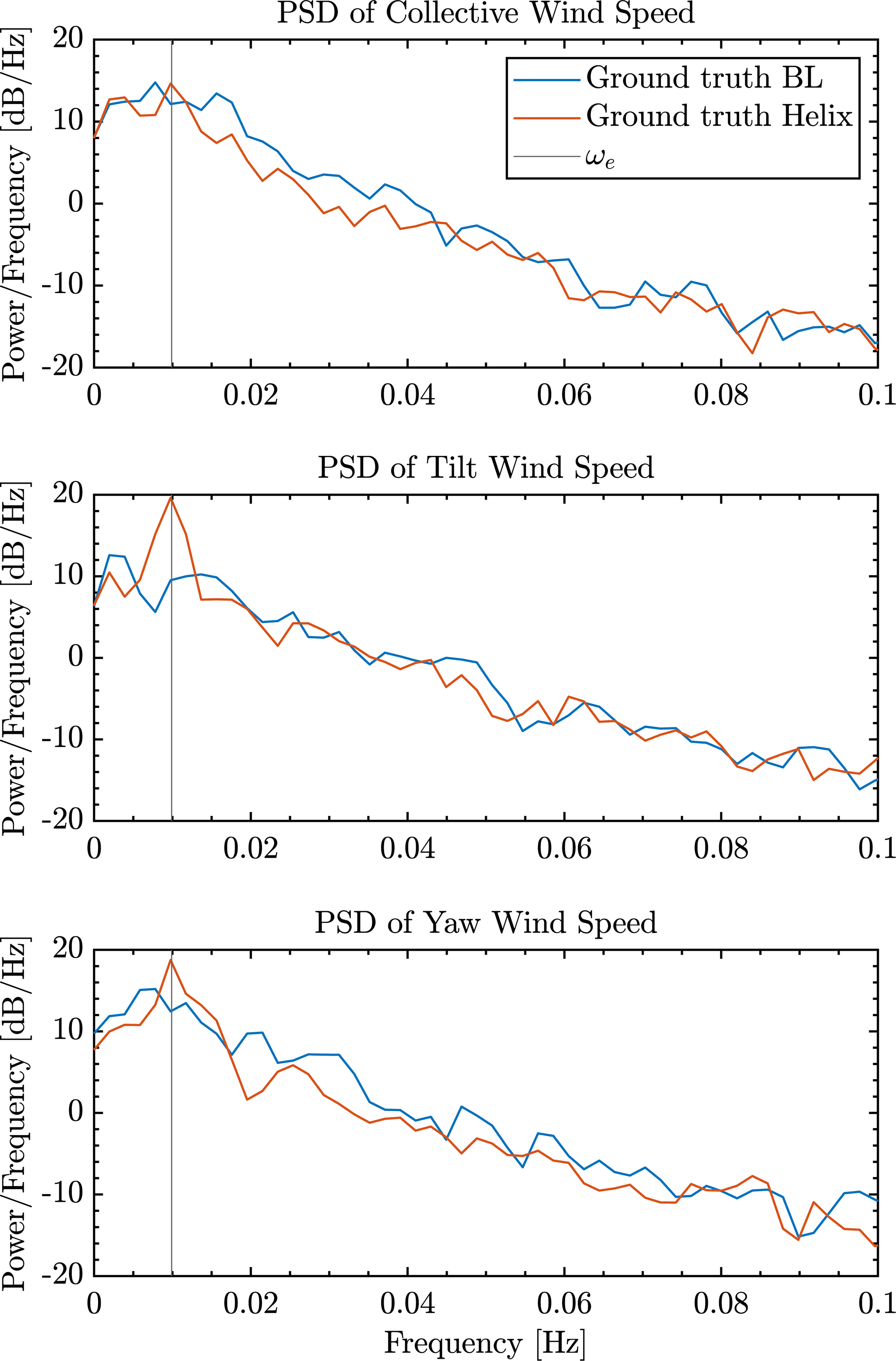 This assumption on the frequency content is supported by Fig. 3, which shows Ucol, Utilt, and Uyaw extracted from the velocity field at 5D behind a single turbine for a Helix and a baseline case. How Utilt and Uyaw are retrieved from the slice of velocity is presented in Sect. 3.3.1. A clear peak at the Helix frequency can be observed, further suggesting that the Helix-induced wake structure, while subject to turbulent mixing, retains a coherent oscillatory pattern as it travels through the wind farm (van Vondelen et al., 2024b; Frederik and van Wingerden, 2022).