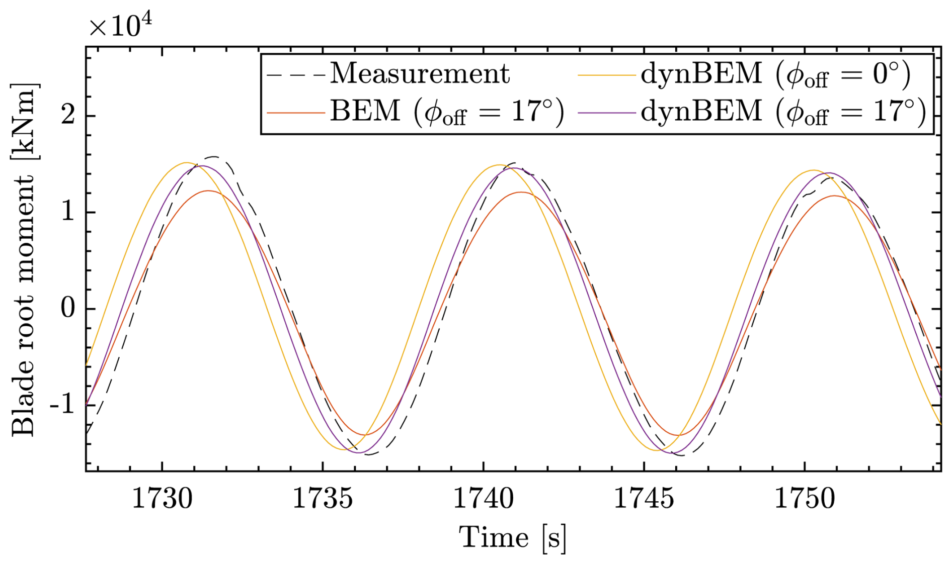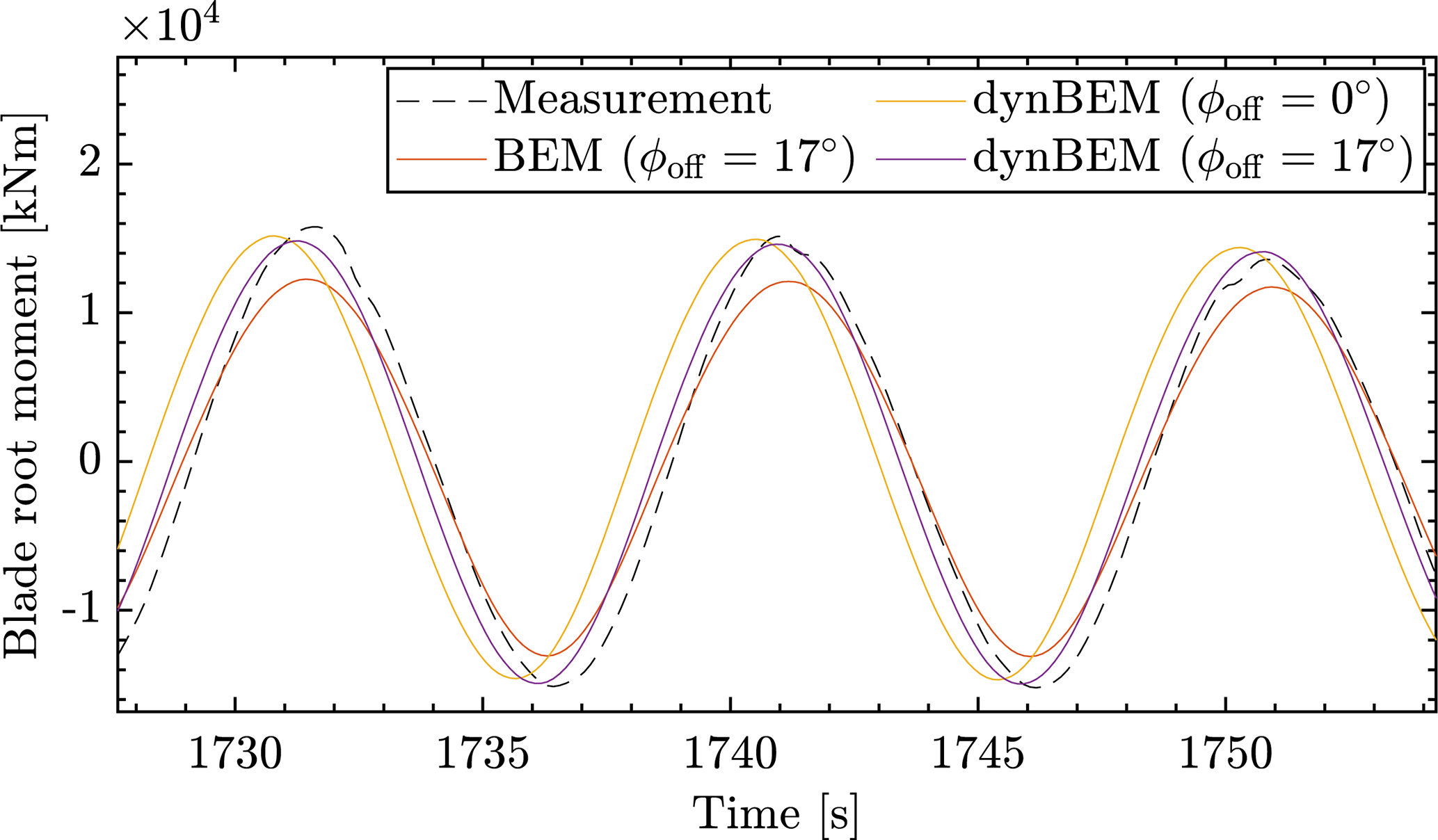 Figure 4 demonstrates the effect of these two corrections of this optimal azimuth offset on the blade root moments computed using the BEM and compared to a reference large-eddy simulation (LES) consisting of an upstream turbine operating the Helix in a laminar inflow. The figure compares