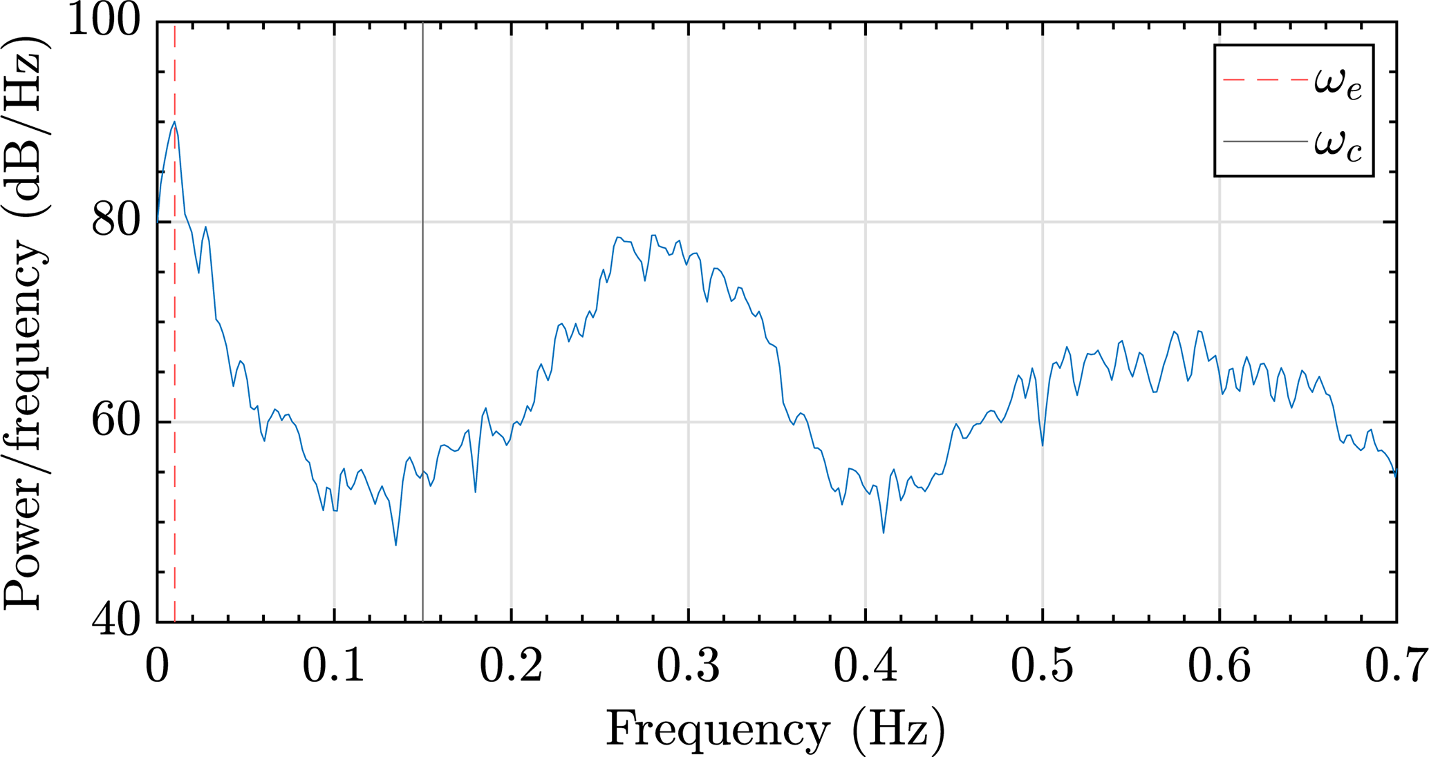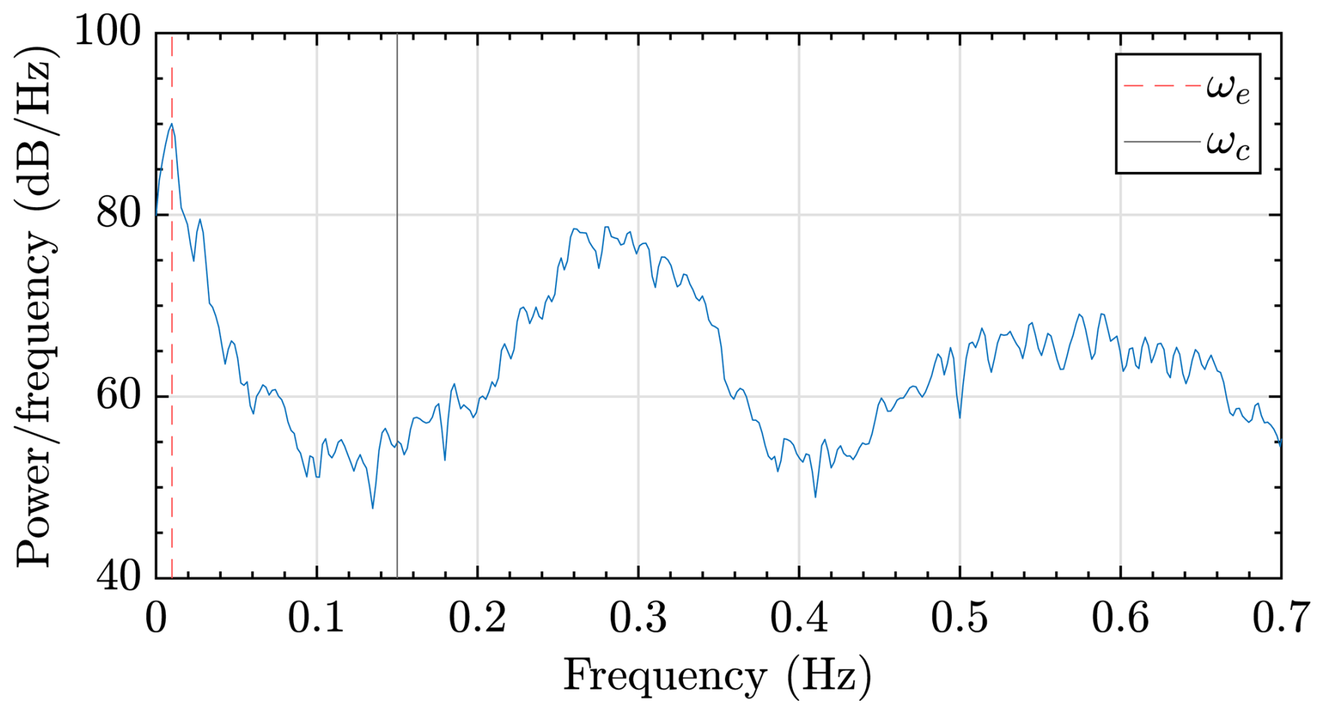 Figure 5Power spectrum analysis of Mtilt: determining the measurement noise covariance matrix (R). The Helix frequency is highlighted with a red dashed line, and the cutoff frequency ωc is denoted by the black line.