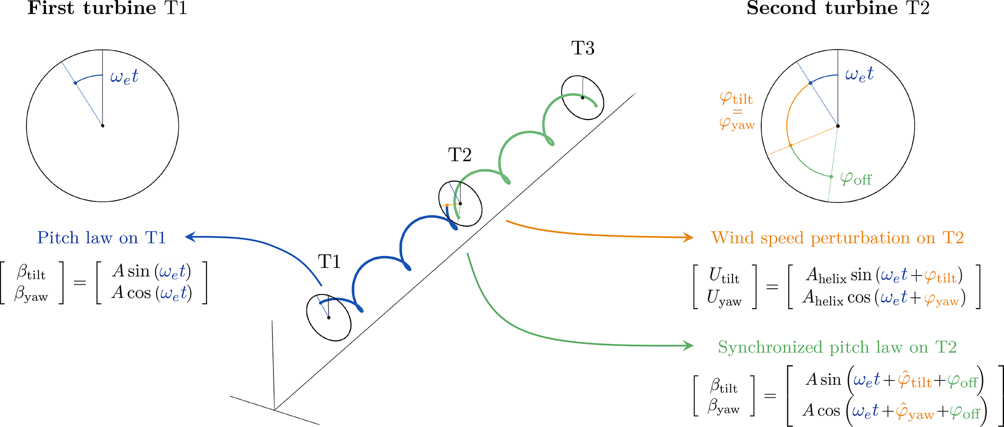 The Helix approach is an open-loop control strategy that enhances the power output of downstream wind turbines by applying periodic signals to the upstream wind turbine's blades (see Fig. 1 for an illustration).