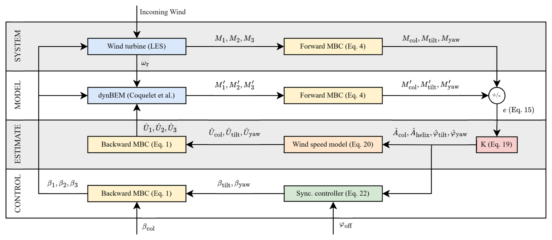 Using an EKF, it is now possible to estimate the uncontrollable input vector . The measurement function is chosen to be the dynBEM model which computes the blade out-of-plane loads based on blade-effective wind speeds (BEWSs), rotor velocity, and pitch angle in the rotating (blade) coordinate frame. It represents a nonlinear measurement mapping dependent on both the controllable and uncontrollable inputs. In practice, h(⋅) first uses the estimated amplitude and phase to generate the fixed-frame periodic wind perturbations,