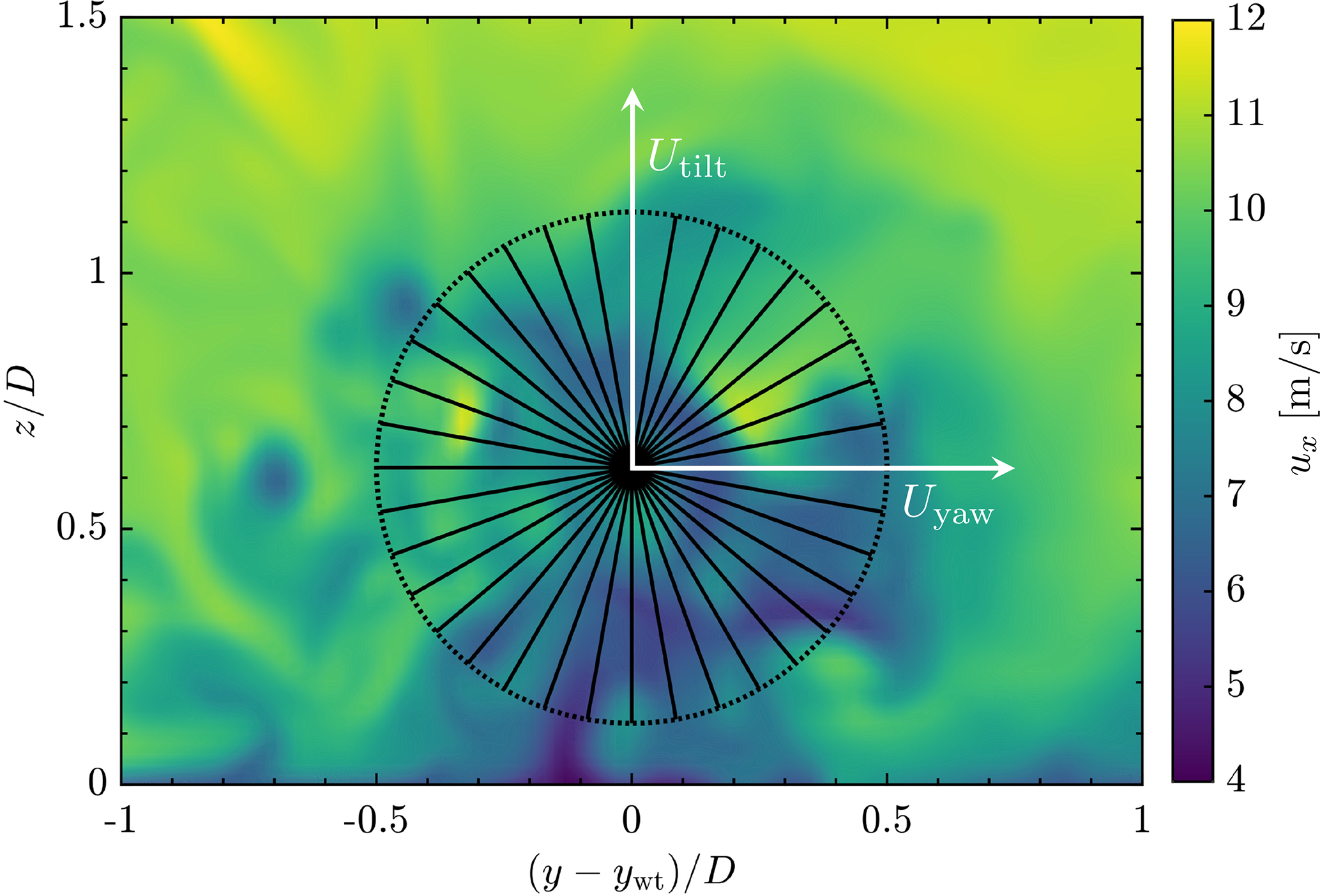 As described in Sect. 2.1, the Helix wake is generated by periodic control actions applied to an upstream turbine (T1). While the fluid dynamics phenomena relating the actuation and the shape of the wake remain an active area of research (Coquelet et al., 2024a; Korb et al., 2023), a consensus is that the Helix wake propagates following a helical shape (see Fig. 1). From a downstream turbine (T2) perspective, this implies that the incoming wind field consists of a wake deficit that is misaligned from the rotor center and rotates around it over time. This can be modeled as wind speed changes in the tilt and yaw directions. To capture this behavior, the wake is then represented as a Utilt and Uyaw sine-like perturbation. The frequency of these perturbations is assumed equal to that of the periodic control input applied at the upstream turbine.