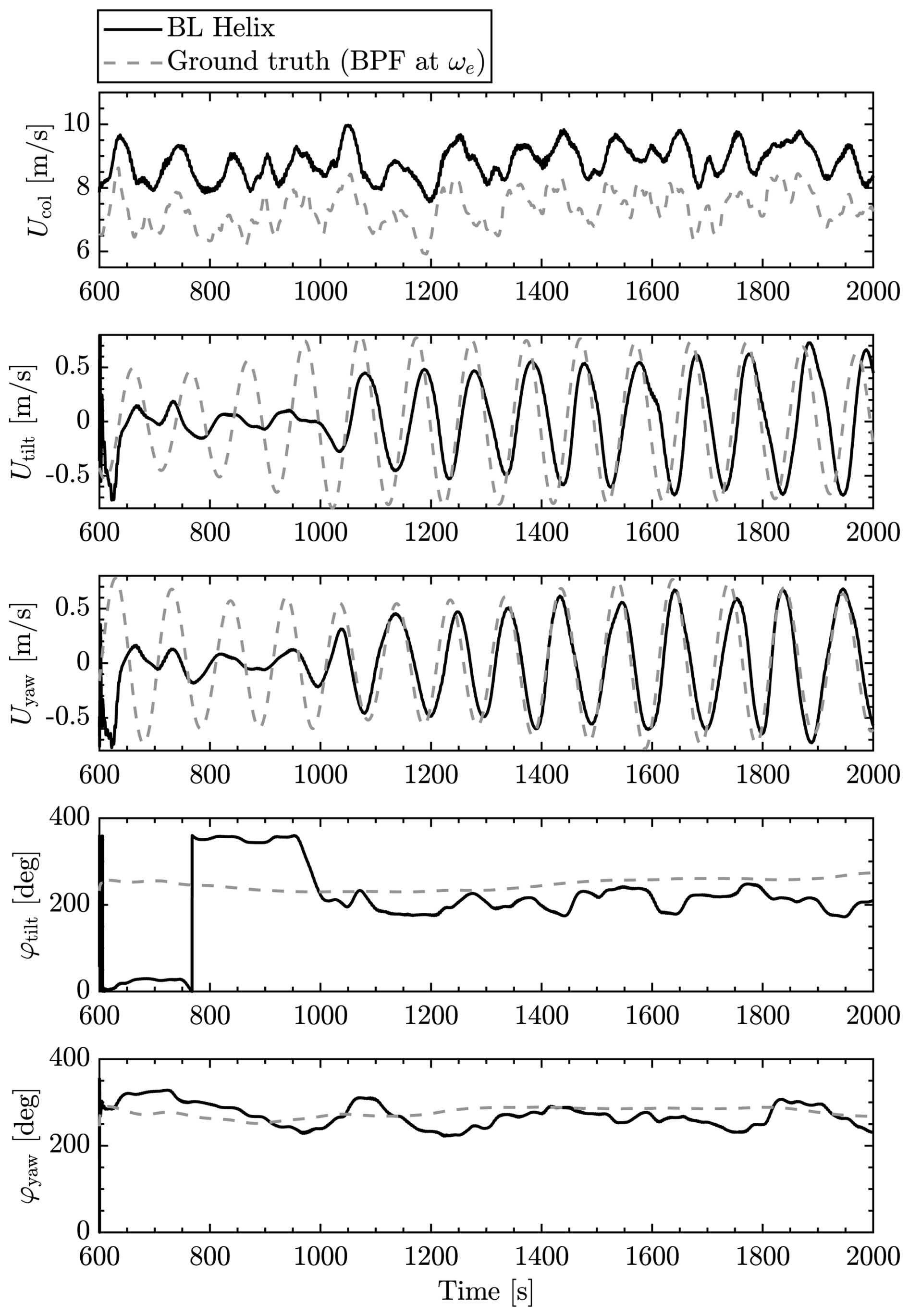 Typically, the actuation commands are provided as tilt and yaw commands in the “fixed” coordinate frame. Using the so-called backward multi-blade coordinate (MBC) transformation (Bir, 2008), the Helix tilt and yaw commands (βtilt and βyaw) are converted into effective pitch commands for each blade (βi, where ):