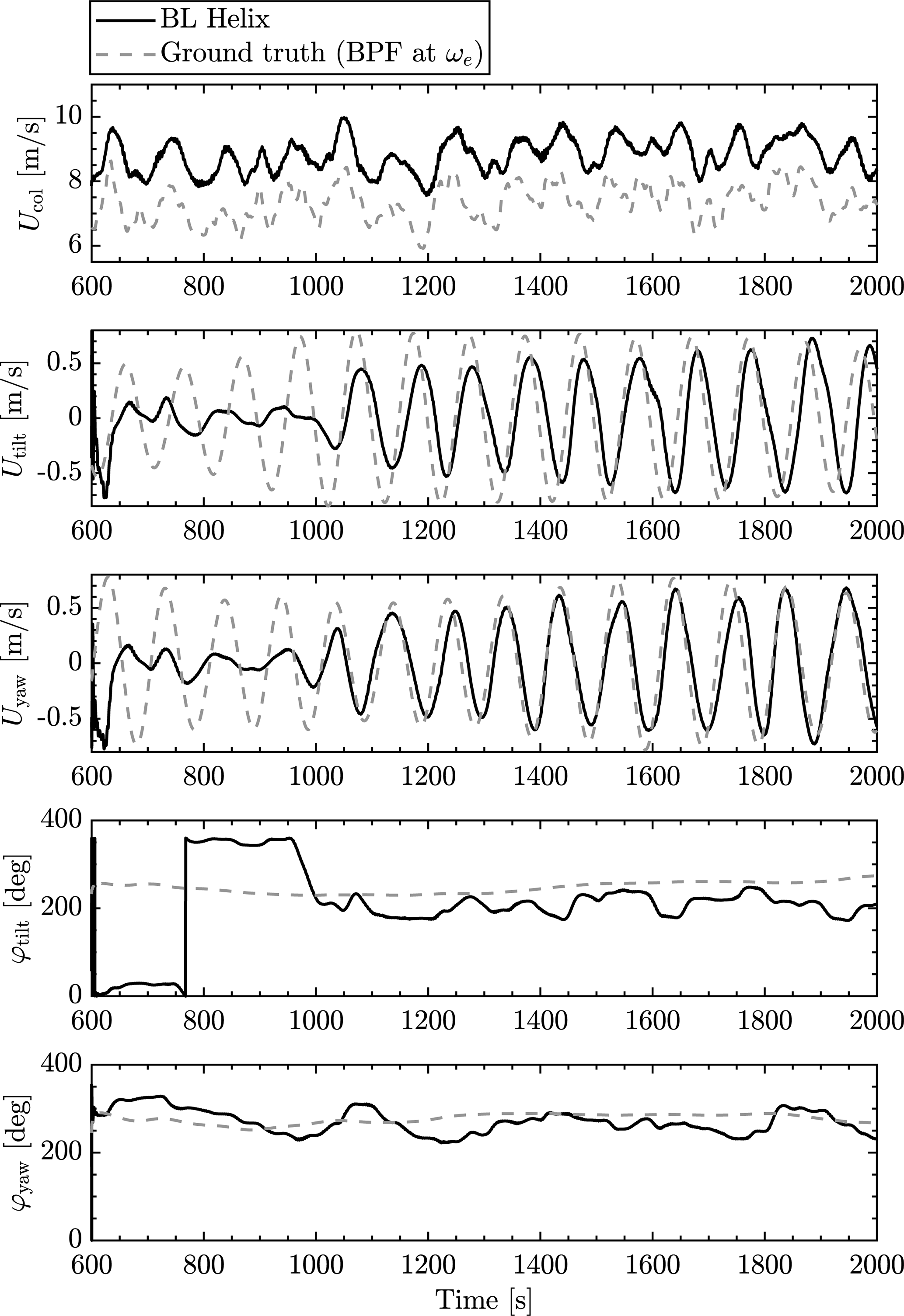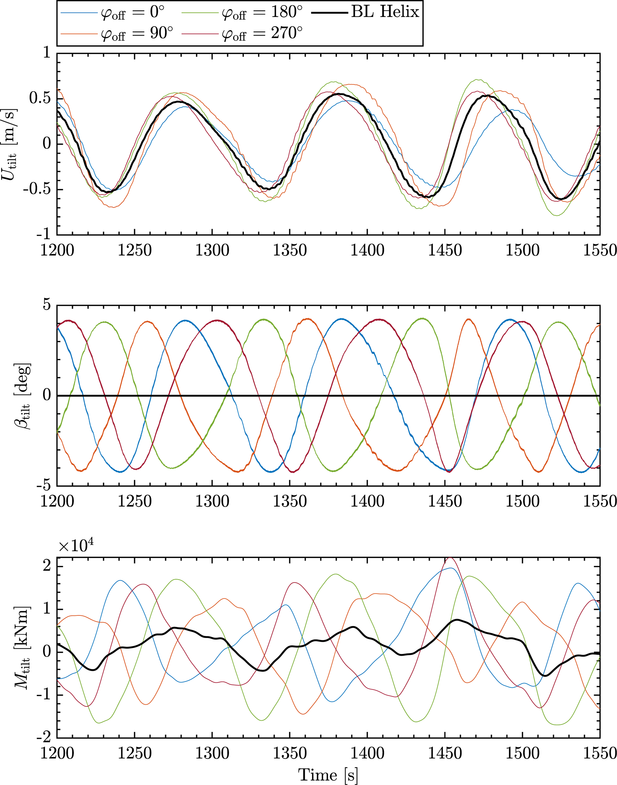 φoff=180°. The pitch acts in opposition of phase with the incoming wind, as described in Sect. 2.6. When the wind speed perturbation Utilt reaches a maximum, the pitch angle βtilt reaches a minimum. From the aerodynamic perspective, this means that the angles of attack increase, and so do the moments. This is confirmed when looking at the signal of the tilt moment Mtilt, whose peak appears at the same location as in the Helix BL case (black curve) but with a higher amplitude. This amplification reflects a constructive interference between the control action and the oscillations in incoming wind speeds induced by the Helix wake.