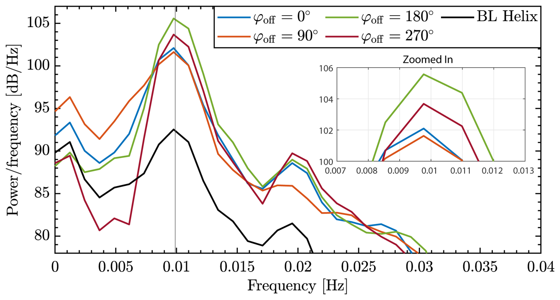 where is the azimuthal position of blade at t=0. Note that , and choosing St≤0.4 for a typical tip speed ratio (TSR) TSR ≈ 6 ensures and thus stays far from any low-frequency aliasing. Typically, the CCW Helix variant yields greater energy gains for the downstream turbine (Frederik et al., 2020a; Taschner et al., 2023), while the CW Helix is preferred for its reduced impact on pitch bearing wear (van Vondelen et al., 2023a), attributed to the lower effective actuation frequency of ωr−ωe.
