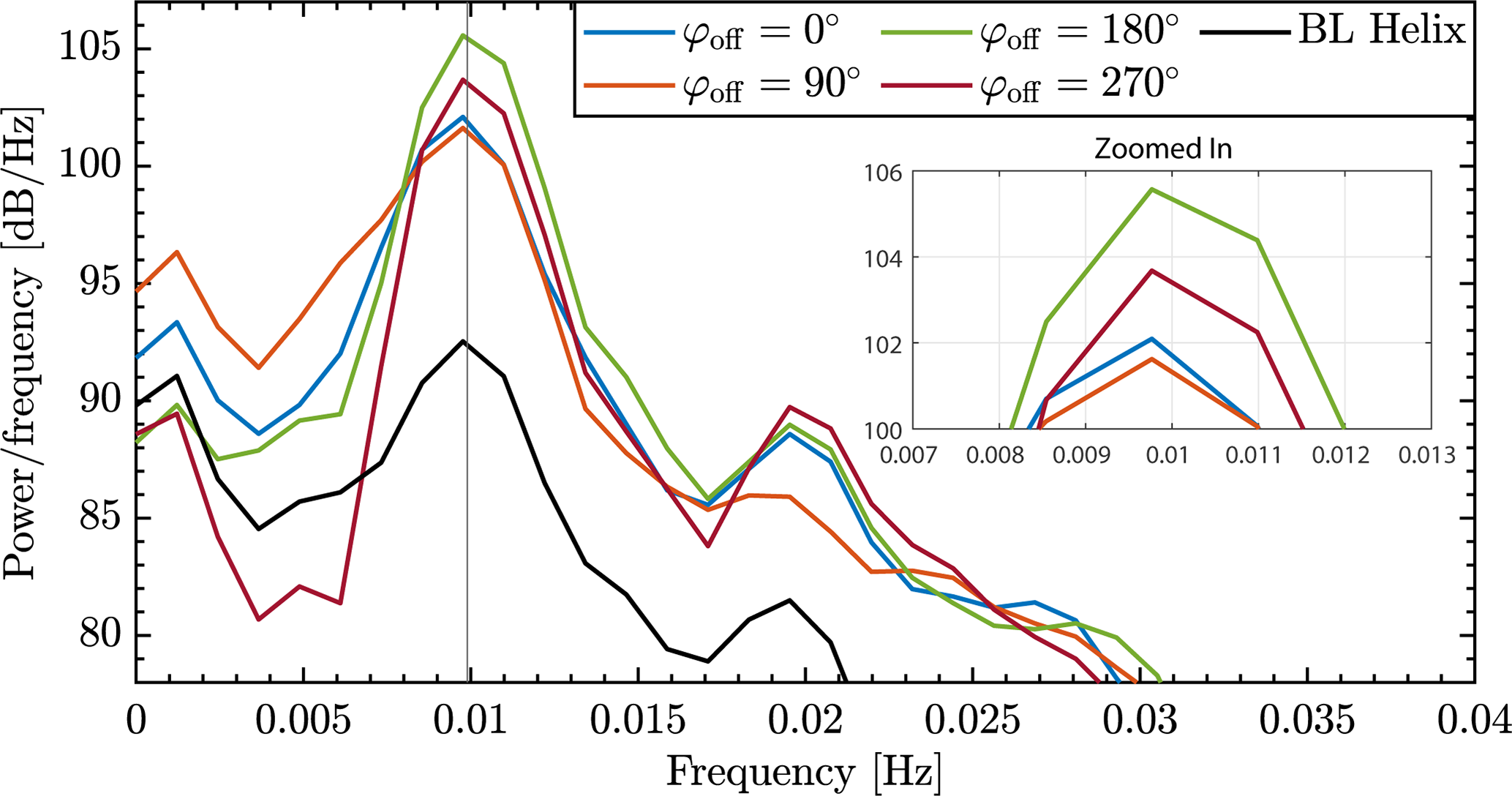 Figure 3Power spectral density comparison at 5D downstream from a turbine using baseline control (blue) and Helix control (red). The Helix wake shows a distinct peak at the excitation frequency fe (black line), confirming the periodic nature of the wake. This periodicity is required for phase estimation and synchronization in downstream turbines.