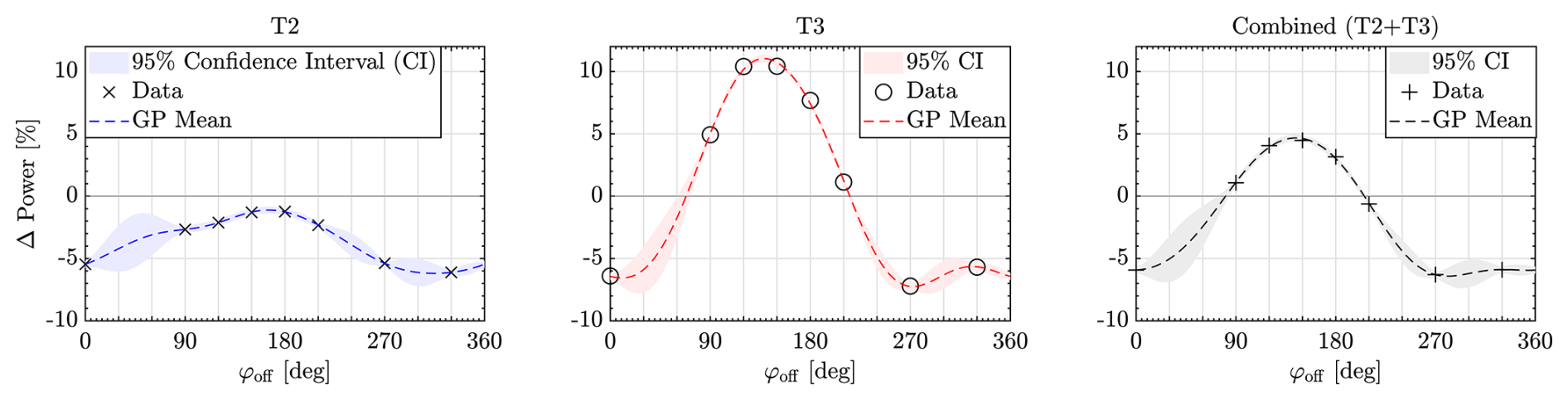 Figure 14Effect of phase offsets in the synchronization controller on power production of downstream turbines. The data points show the relative power change, while the Gaussian process confidence interval shows uncertainty at untested phase offsets. Note that the power differences shown are with respect to the BL Helix case (see Table 2). Hence, the power increases are on top of the power increases already generated by implementing the Helix on the upstream turbine.