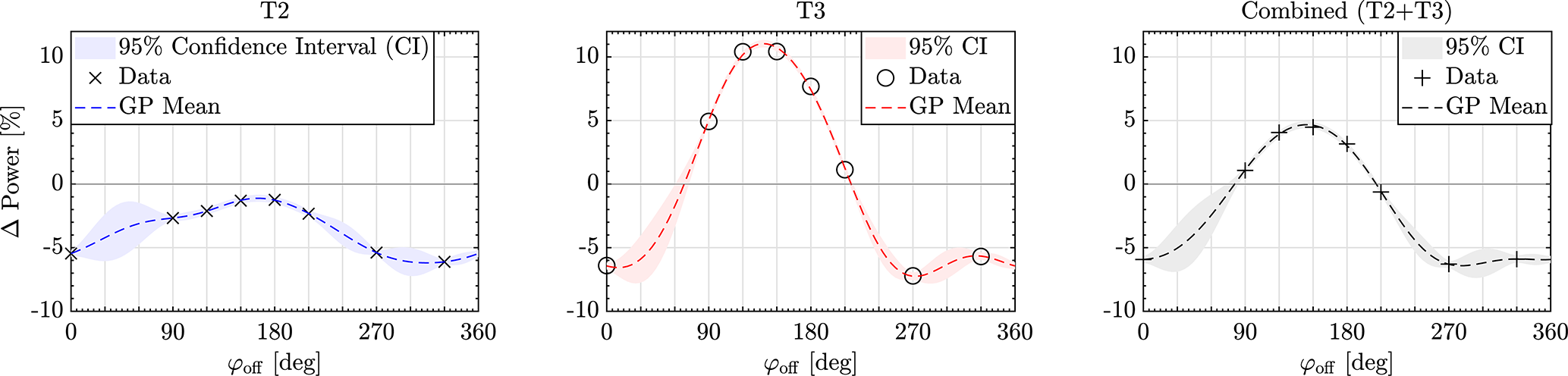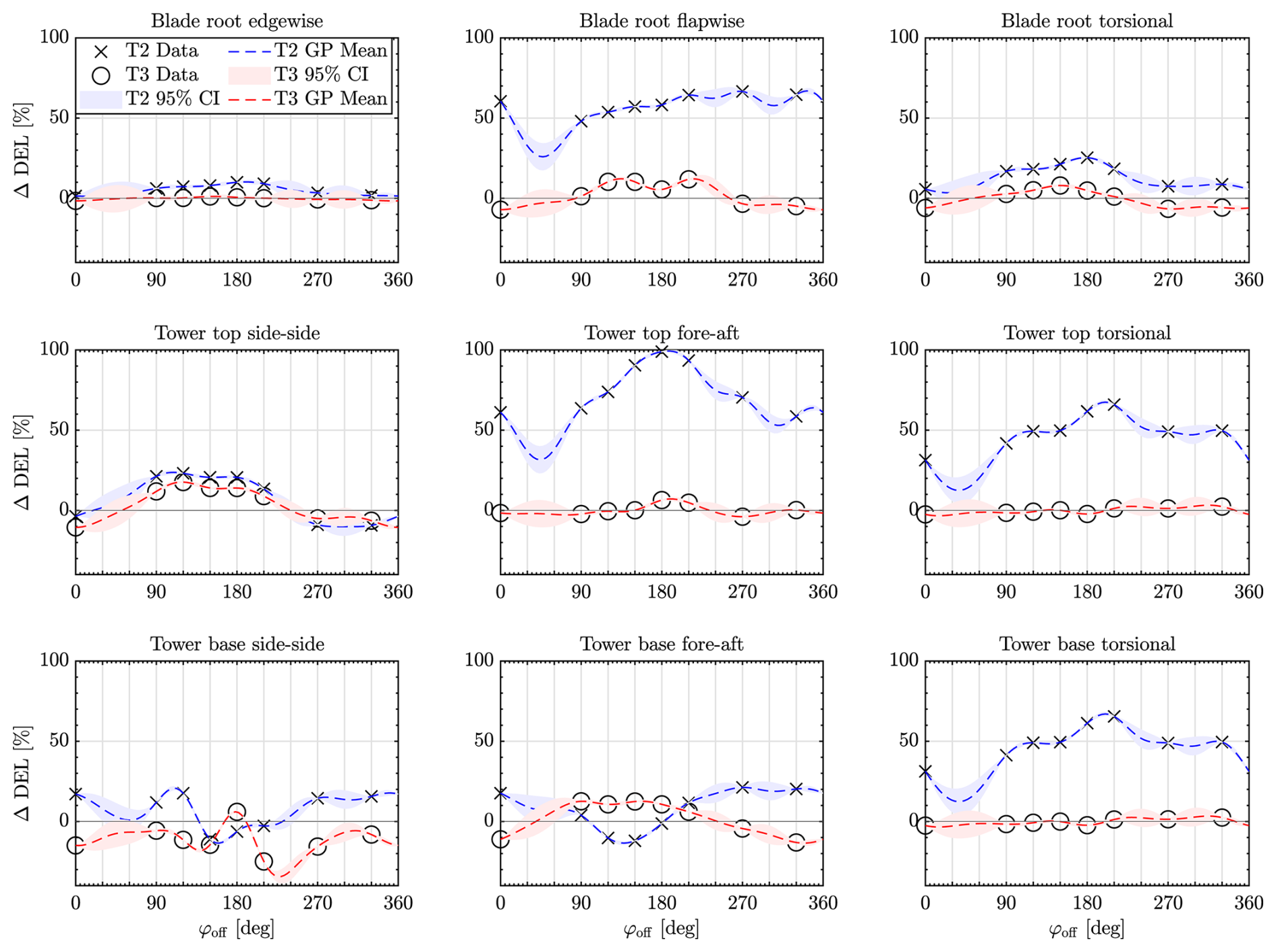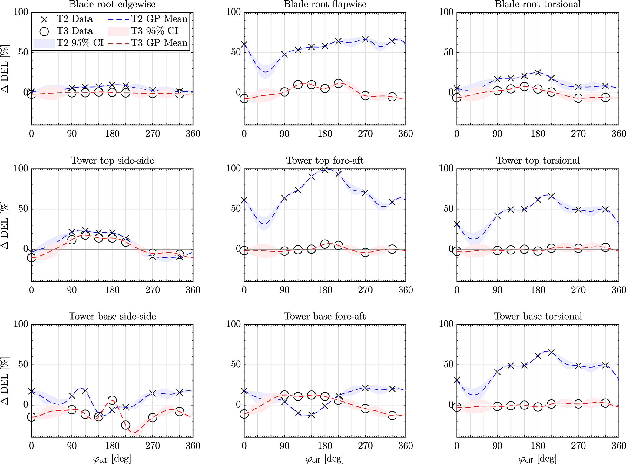 Figure 15Effect of phase offsets in the synchronization controller on damage-equivalent loads for both T2 and T3. The data points show the relative DEL change, while the Gaussian process confidence interval shows the uncertainty of the DEL change at untested phase offsets. CI denotes confidence interval. Note that the load differences shown are with respect to the BL Helix scenario (see Table 2).