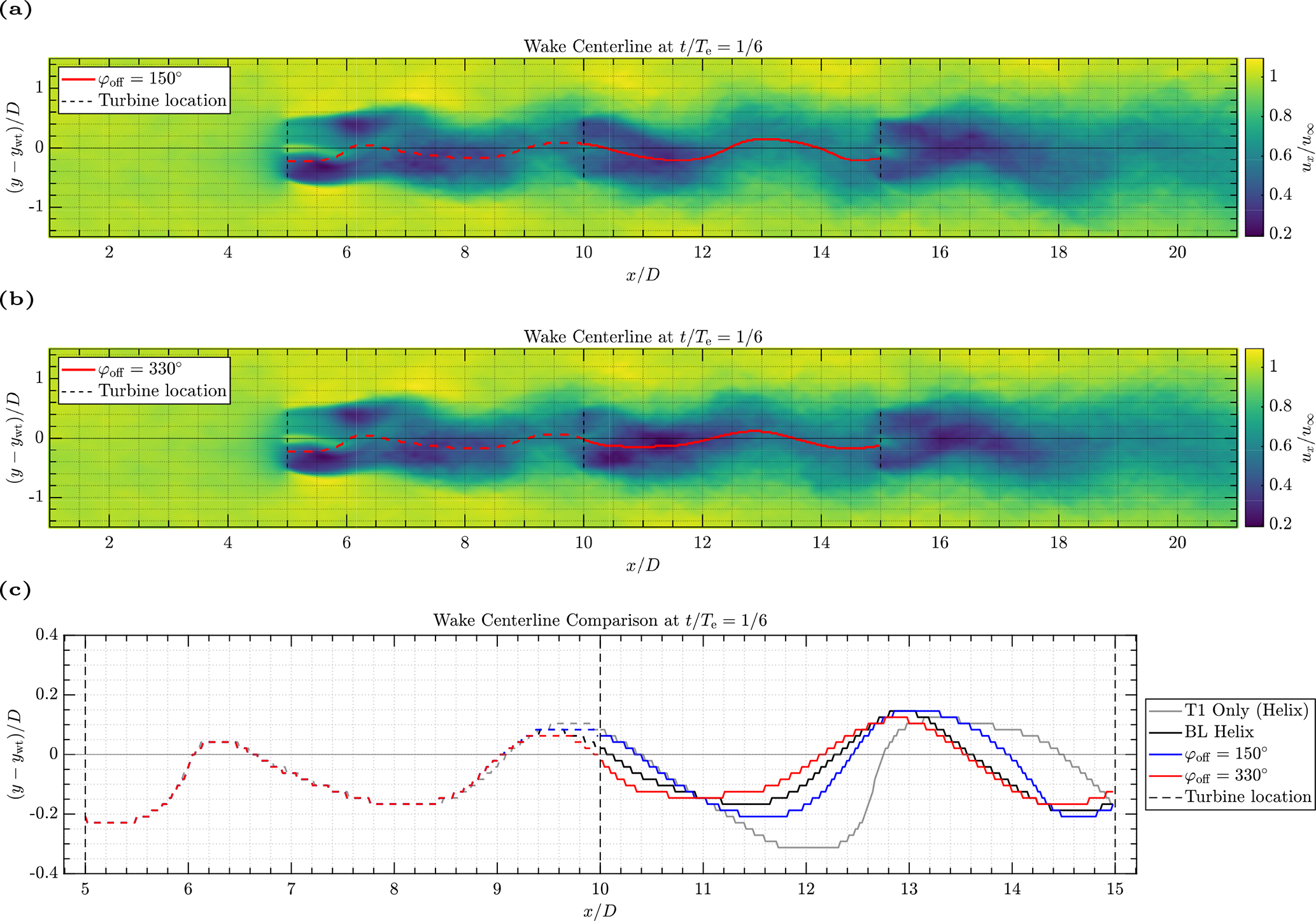 Figure 16a illustrates the phase-averaged horizontal velocity deficit fields for the 150° phase shift case, which yielded the highest collective power gain. Figure 16b shows the phase-averaged horizontal velocity deficit fields for the 330° phase shift case, which, together with the 270° case, was the worst-performing in terms of power gain. Here, we choose to compare 150 and 330° since they are 180° apart. Figure 16c overlays the wake centerlines from Fig. 16a–b with the wake centerlines from the cases T1 only (Helix) and BL Helix. This highlights that the wake displacement is higher behind T2 for the 150° scenario, with the wake exhibiting a more sustained structure thanks to constructive interference created at the rotor. The amplitude of the 330° case appears more flattened after T2, we identify this as the result of the destructive interference with the incoming wake. Sustaining rather than going against the Helix oscillation on T2 therefore leads to enhanced displacement of T2, which contributes to the higher power produced by T3 in the 150° case.