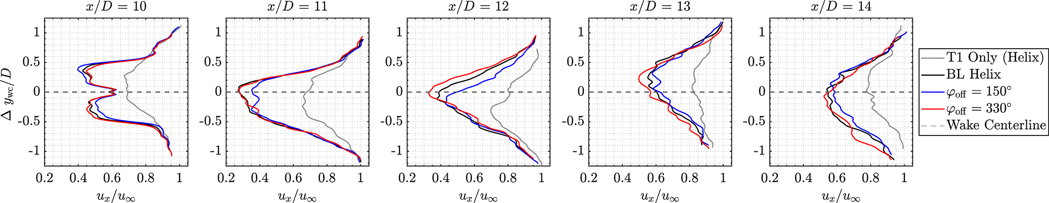Lastly, in Fig. 17, we examine the velocity deficits across the wake's width at several instances behind T2. To obtain these results, the wake centers have been recentered to zero using the wake centerline. This enables us to separate the effects of wake displacement and wake deficit reduction when it comes to the increased power on T3. This figure shows that the in-phase control (φoff=150°) not only enhances the lateral/vertical displacement of the downstream wake but also reduces the intensity of the wake deficit. This 150° case enhances the combined effects of the Helix: it promotes wake deficit recovery through mixing, but also enhances lateral wake displacement, which could be assimilated to forced/enhanced meandering. These combined effects explain the higher power leveraged at T3.