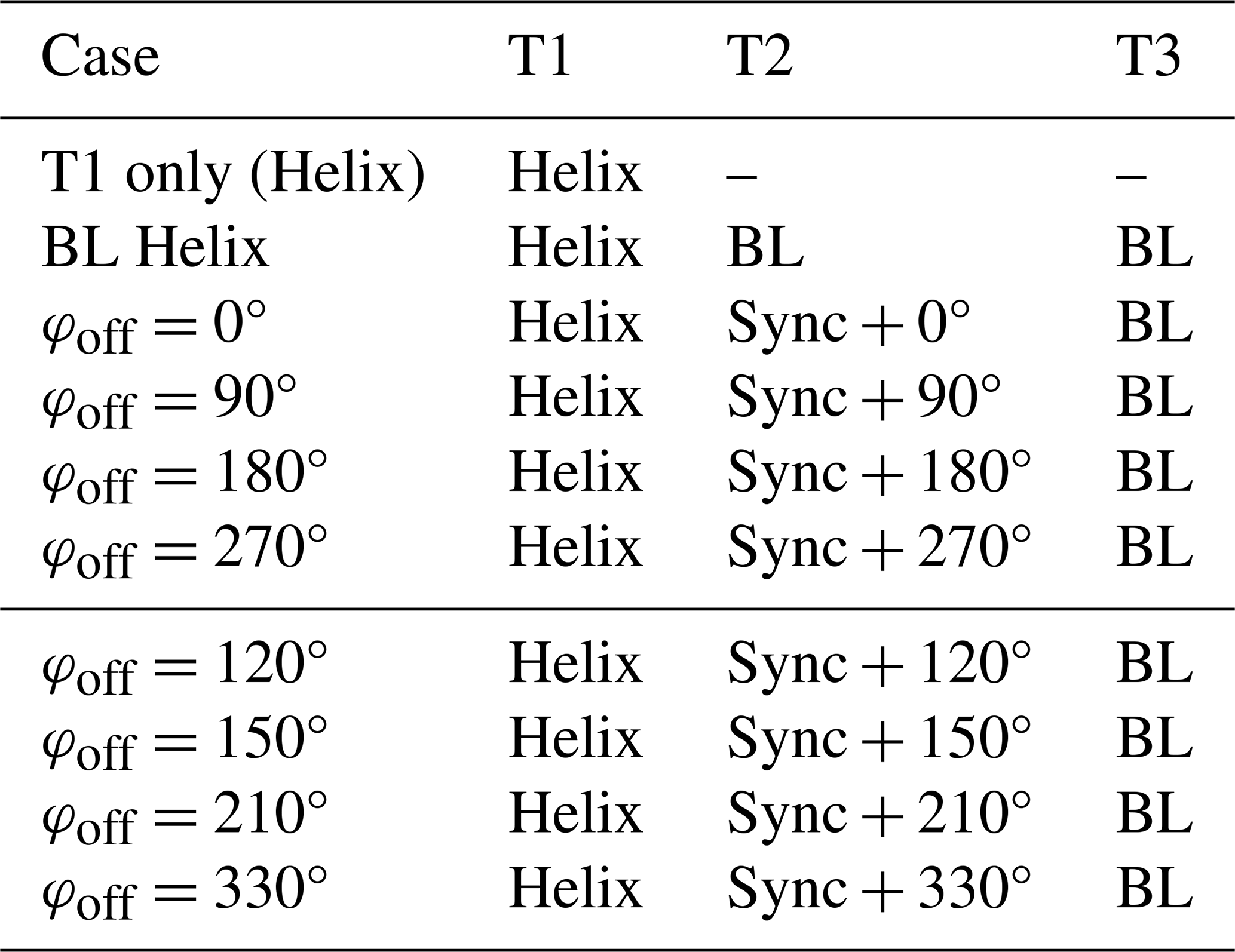 Most studies have applied the Helix approach to an upstream turbine, maintaining baseline control for the downstream turbines. However, in multi-turbine arrays, applying the Helix approach to multiple turbines could potentially enhance overall power production further. For instance, Korb et al. (2023) explored a three-turbine setup with the two upstream turbines employing Helix and the downstream turbine employing baseline control. They found that the power output depends on the phase shift between the two Helix wakes, though they did not propose a method for achieving this phase difference. Similar results were found in a three-turbine wind tunnel experiment with DIC (van Vondelen et al., 2024c). However, both studies also observe power losses at certain phase shifts, highlighting the importance of optimizing the synchronization.