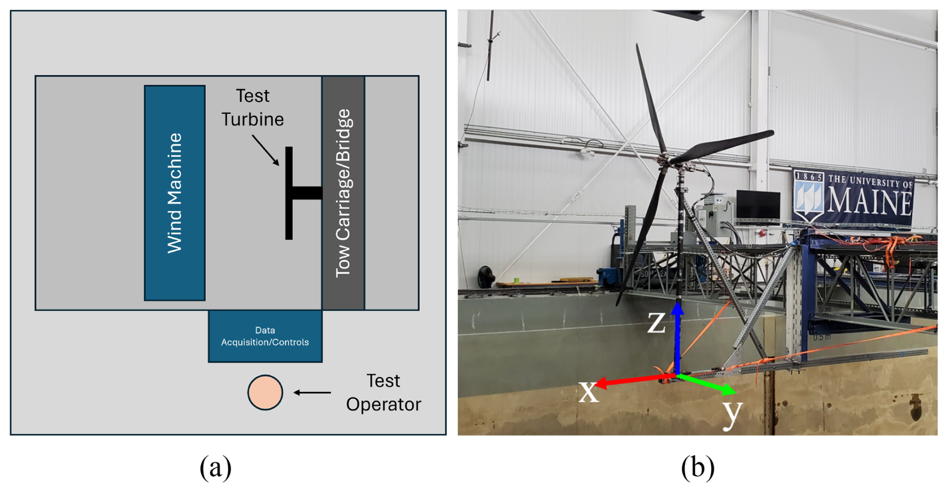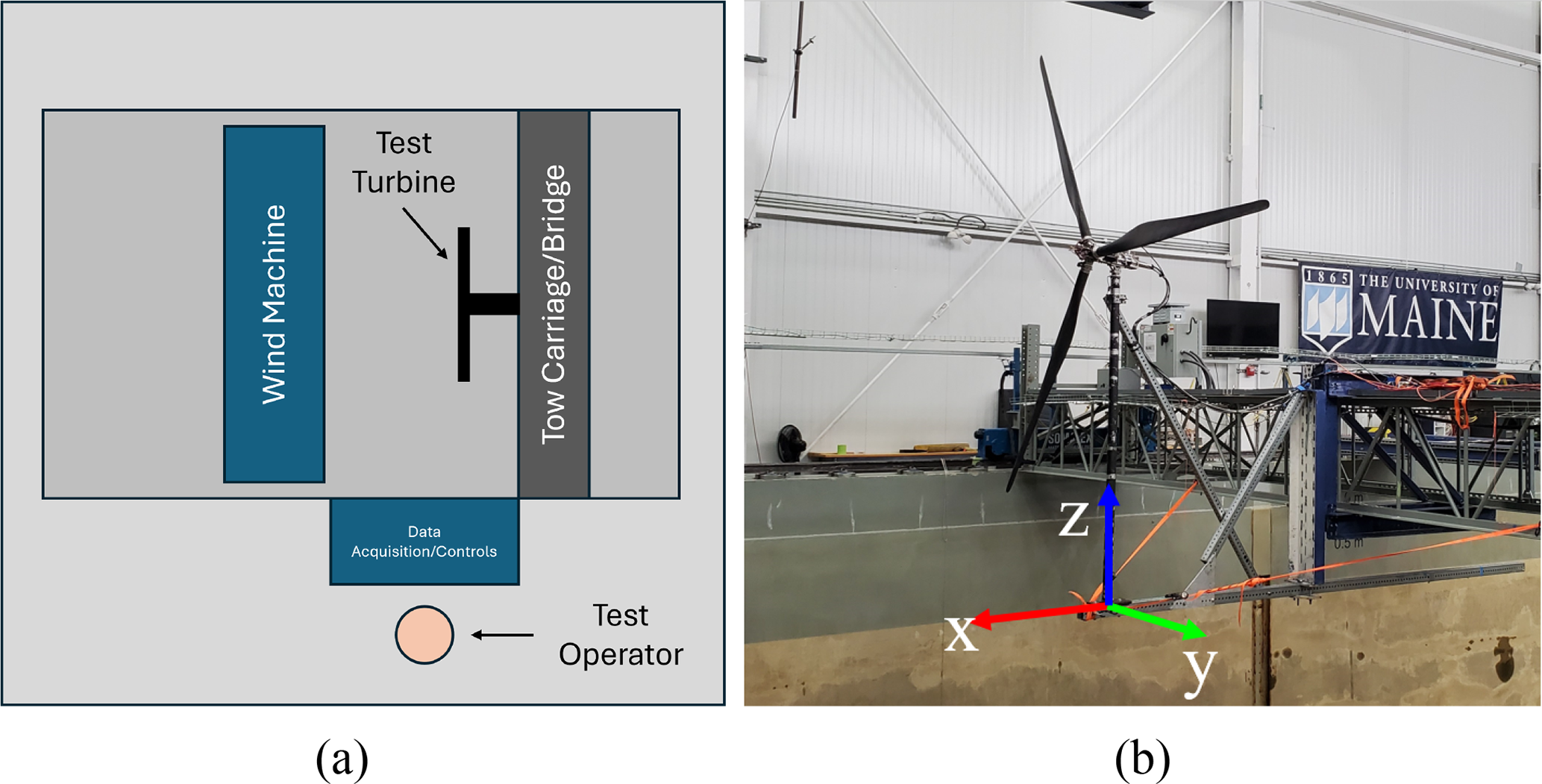 The experimental data for this study come from a wind turbine characterization test performed on a scale model at the Harold Alfond Ocean Engineering Laboratory at the University of Maine's Advanced Structures and Composites Center. The layout of the experiment is shown in Fig. 1a, illustrating the arrangement of the wind machine and turbine model. During the experiments, the turbine was controlled and monitored by one or two test operators stationed on the side of the basin, via a data acquisition system (DAQ) based on the National Instruments cRIO platform. Figure 1b shows the installed experimental turbine before testing began. To properly characterize the turbine's aerodynamic performance, it was installed in a fixed configuration within the wind field. Cross-bracing was installed to keep the turbine tower and mounting surface rigid during the test to target rotor performance only.