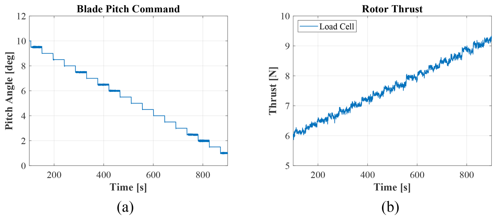 Figure 2(a) Scheduled blade pitch and (b) measured rotor thrust for sample characterization experiment run.