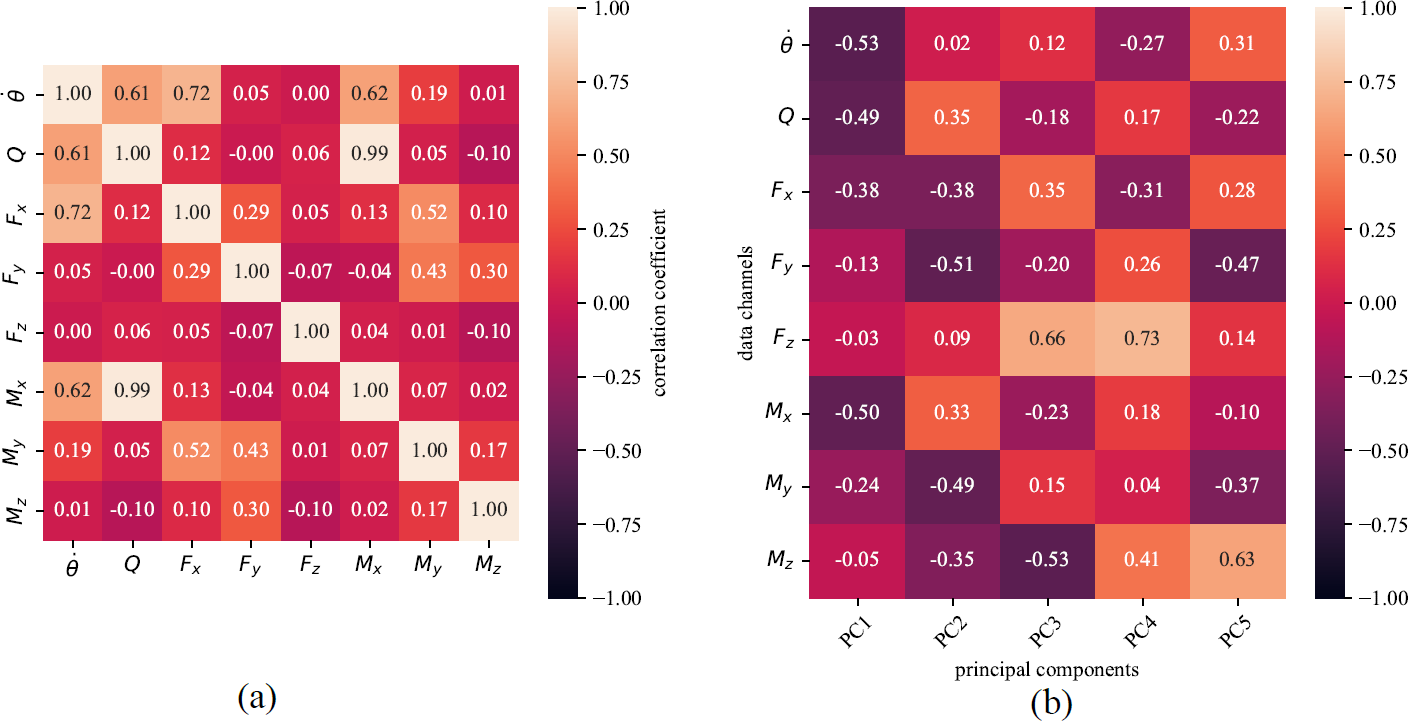 Before performing the analysis, the raw data recorded by the data acquisition system were pre-processed to remove idle measurements and non-numeric entries. Data channels collected comprise wind speed, the angular velocity of the rotor, azimuth angle, all blade pitch angles, generator torque, rotor torque, and forces and moments at the base of the tower. We assume the digital twin has access to only some of these channels (i.e., angular velocity, ; rotor torque, Q; and tower base forces and moments, ) to simulate cases where some measurements can be restricted by turbine manufacturers and validate the model's operability under restrictive data access. Figure 4a illustrates the correlation matrix between the channels of interest.