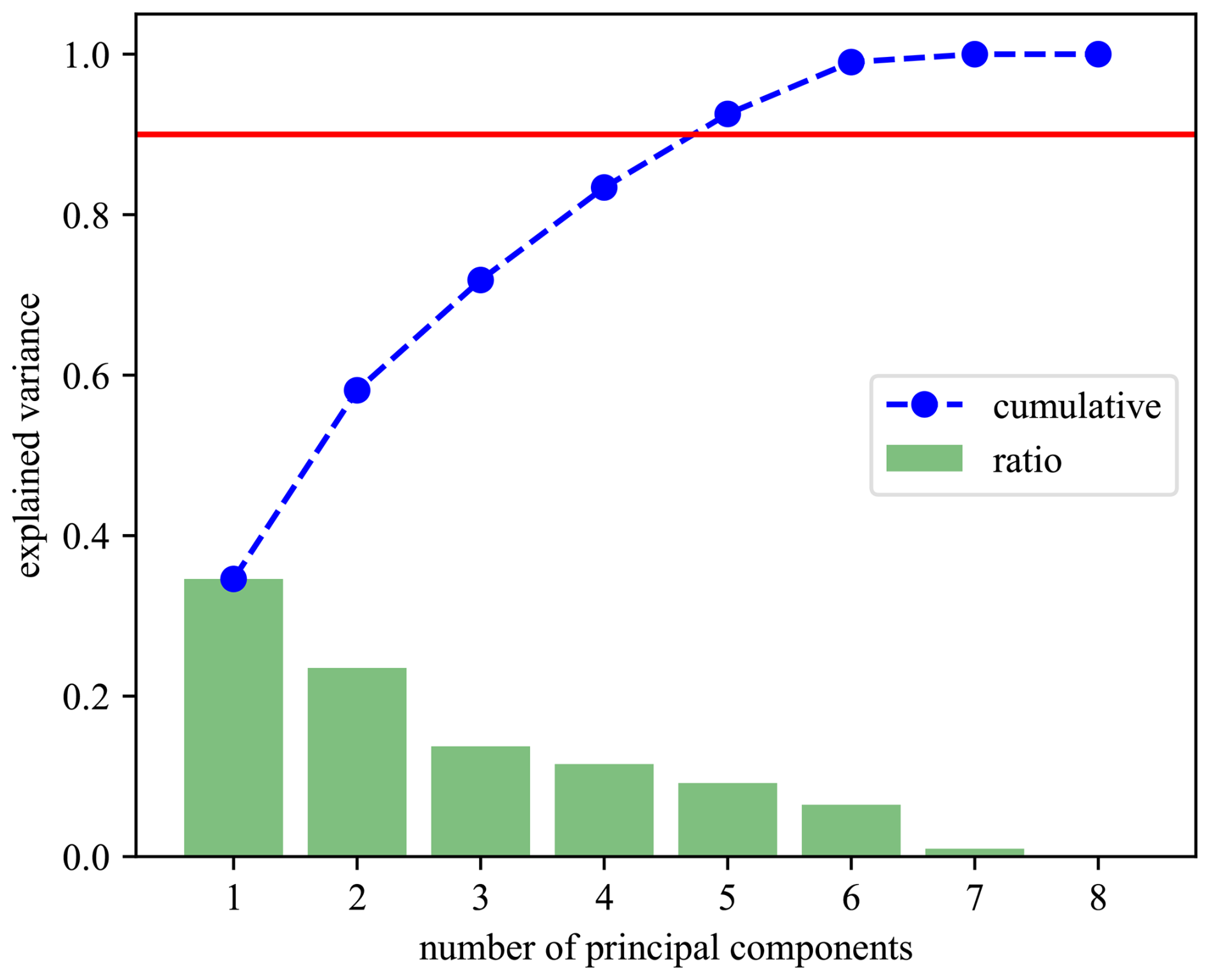 The two models developed vary in their projected principal component selection. The projected PC results from training data are presented in Fig. 6. The first model compresses the data by retaining only the first PC; it is therefore named “1PC”. The second model selects the group of (M) PCs that cumulatively explain 90 % of the total variance, thus only neglecting the remaining 10 %; this model is hence called “MPC”.