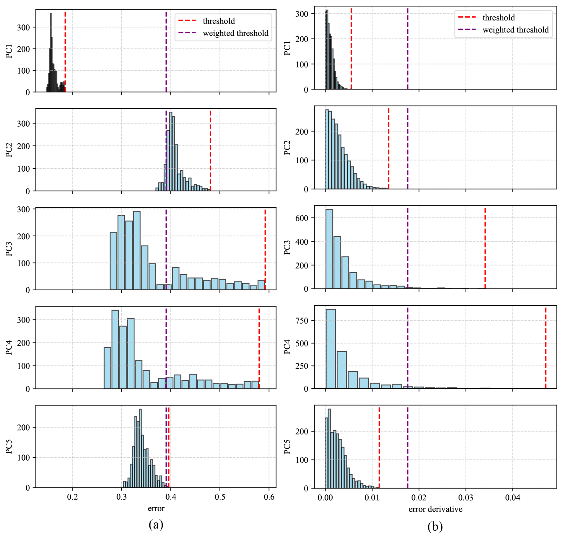 Figure 71PC histograms of the (a) error and (b) error derivative, generated by comparing the model with the training data, and the maximum error/error derivative as the selected threshold.