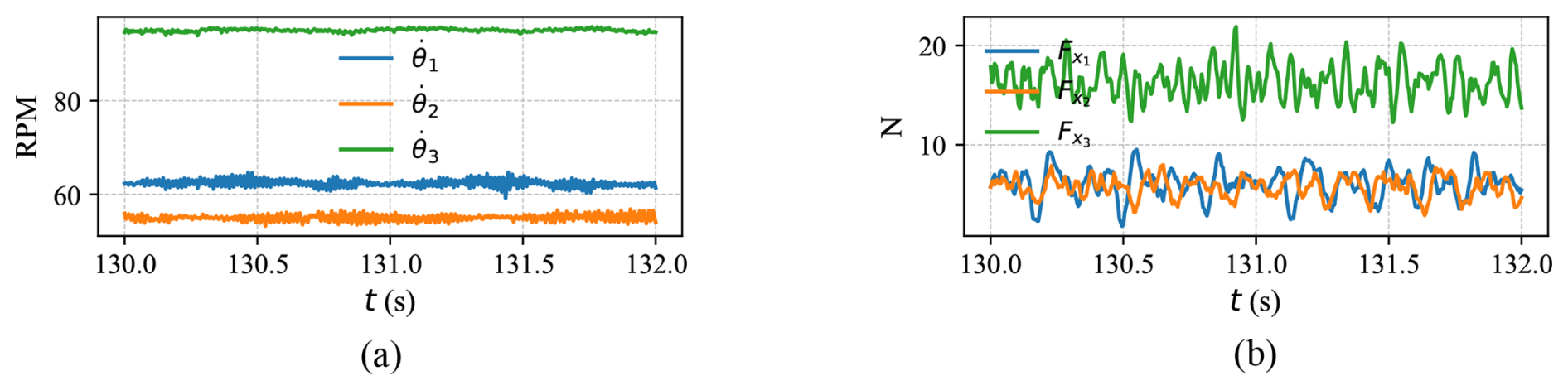 Figure 9Three experimental datasets and their variations in (a) angular velocities and (b) thrust forces.